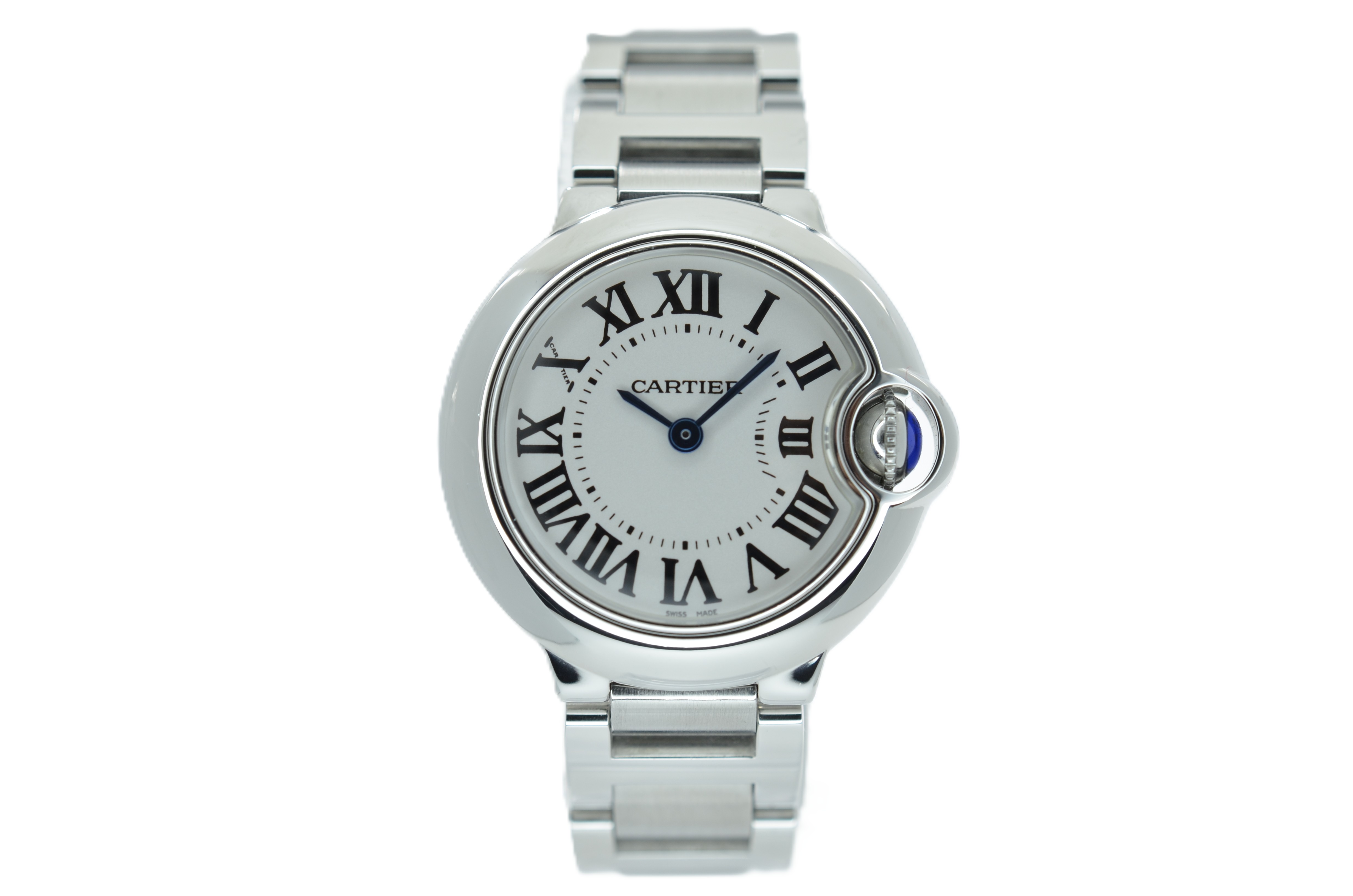 This Cartier Ballon Bleu De Cartier W69010Z4 has a silver roman numeral dial and a bracelet strap. This Cartier has undergone a thorough inspection of accuracy, functionality and condition at our Cartier certified service centre to determine the level of reconditioning required to meet our strict standards. It has also been checked against our records to ensure authenticity. All our watches have a 24-month warranty for your peace of mind.