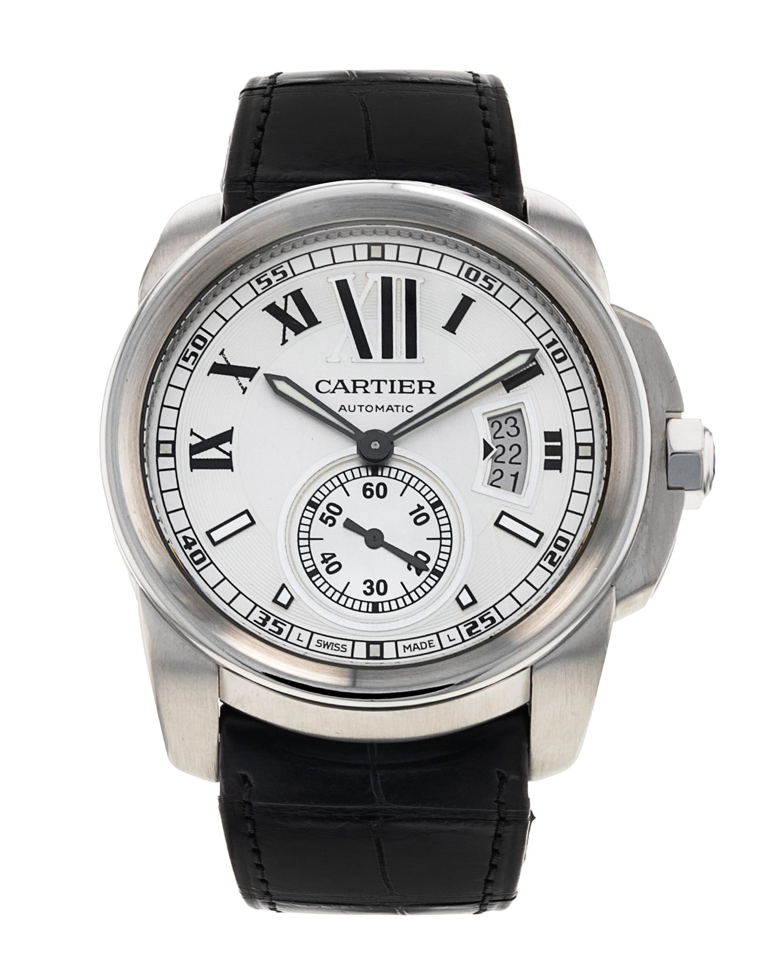 This Cartier Calibre De Cartier W7100037 has a white roman numeral dial and a leather strap. This Cartier has undergone a thorough inspection of accuracy, functionality and condition at our Cartier certified service centre to determine the level of reconditioning required to meet our strict standards. It has also been checked against our records to ensure authenticity. All our watches have a 24-month warranty for your peace of mind.