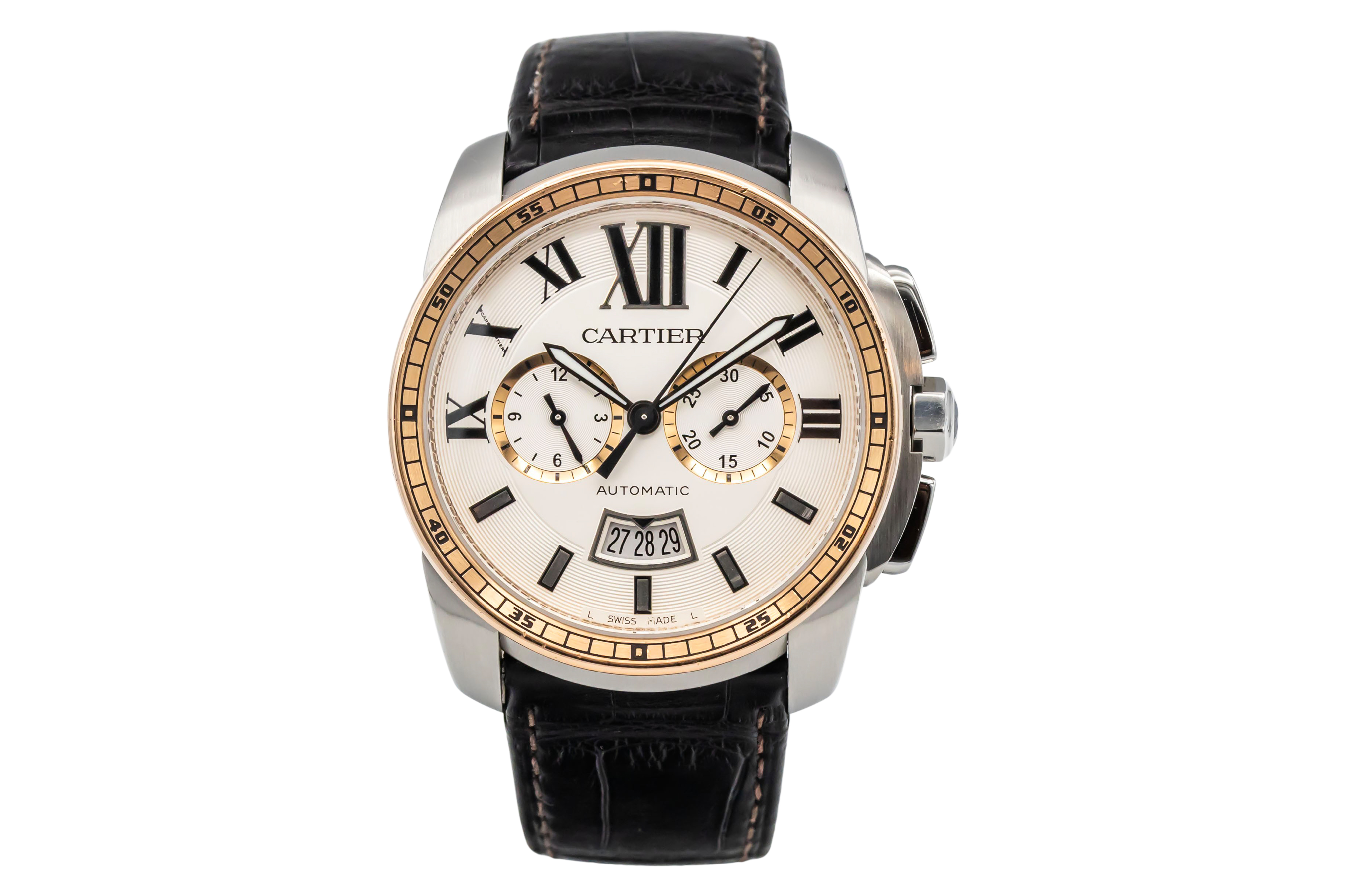 This Cartier Calibre De Cartier W7100043 has a silver roman numeral dial and a leather strap. This Cartier has undergone a thorough inspection of accuracy, functionality and condition at our Cartier certified service centre to determine the level of reconditioning required to meet our strict standards. It has also been checked against our records to ensure authenticity. All our watches have a 24-month warranty for your peace of mind.