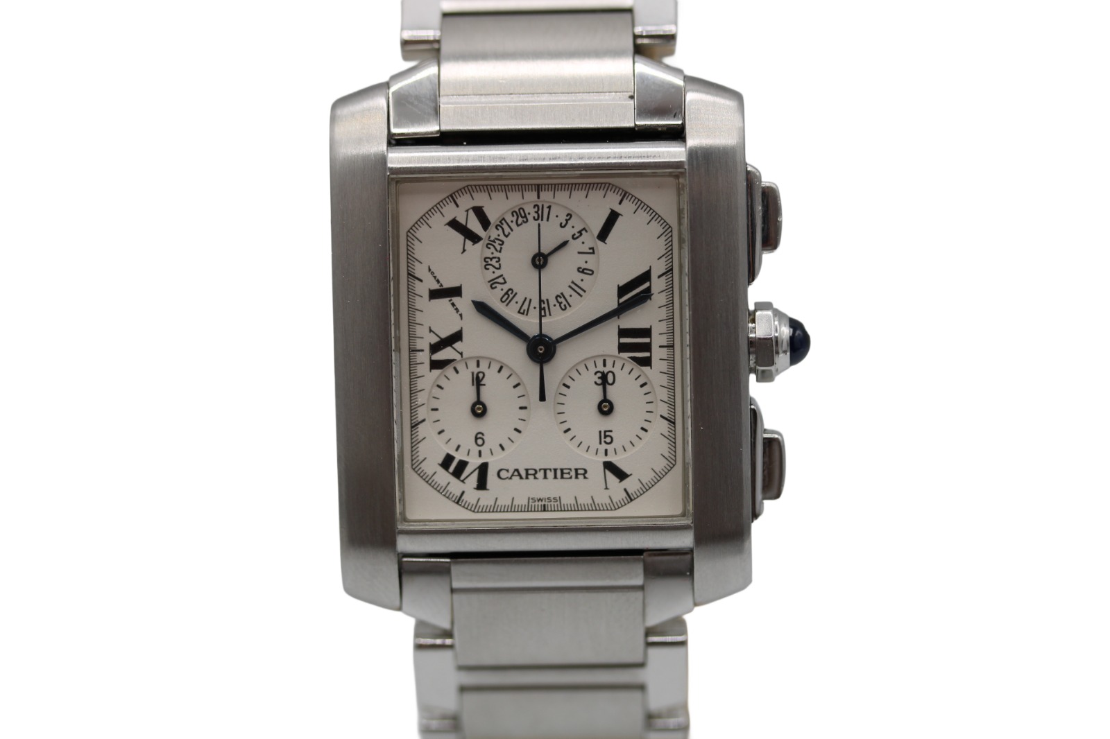 This Cartier Chronoflex W51001Q3 has a white roman numeral dial and a bracelet strap. This Cartier has undergone a thorough inspection of accuracy, functionality and condition at our Cartier certified service centre to determine the level of reconditioning required to meet our strict standards. It has also been checked against our records to ensure authenticity. All our watches have a 24-month warranty for your peace of mind.