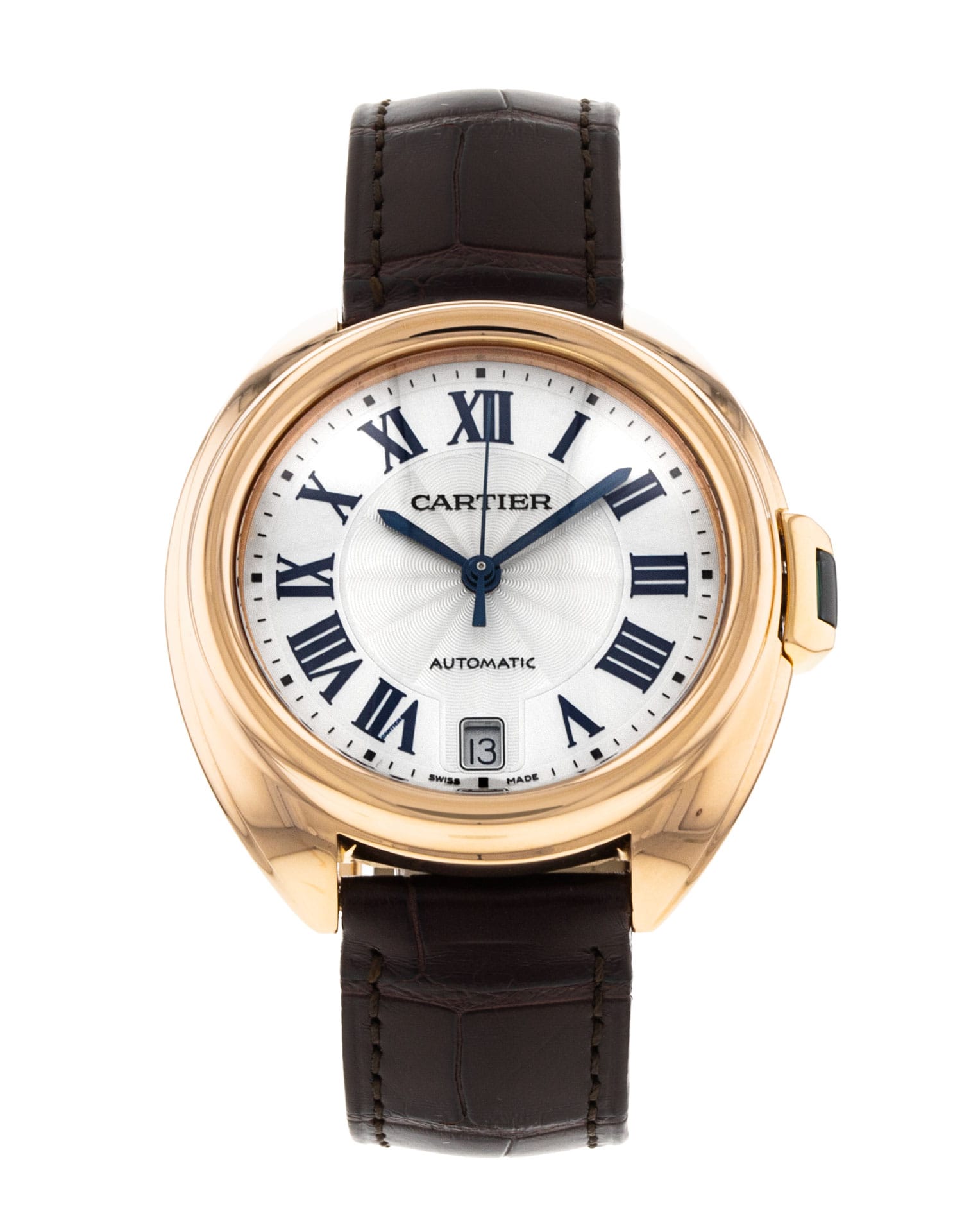 This Cartier Cle De Cartier WGCL0013 has a silver roman numeral dial and a leather strap. This Cartier has undergone a thorough inspection of accuracy, functionality and condition at our Cartier certified service centre to determine the level of reconditioning required to meet our strict standards. It has also been checked against our records to ensure authenticity. All our watches have a 24-month warranty for your peace of mind.
