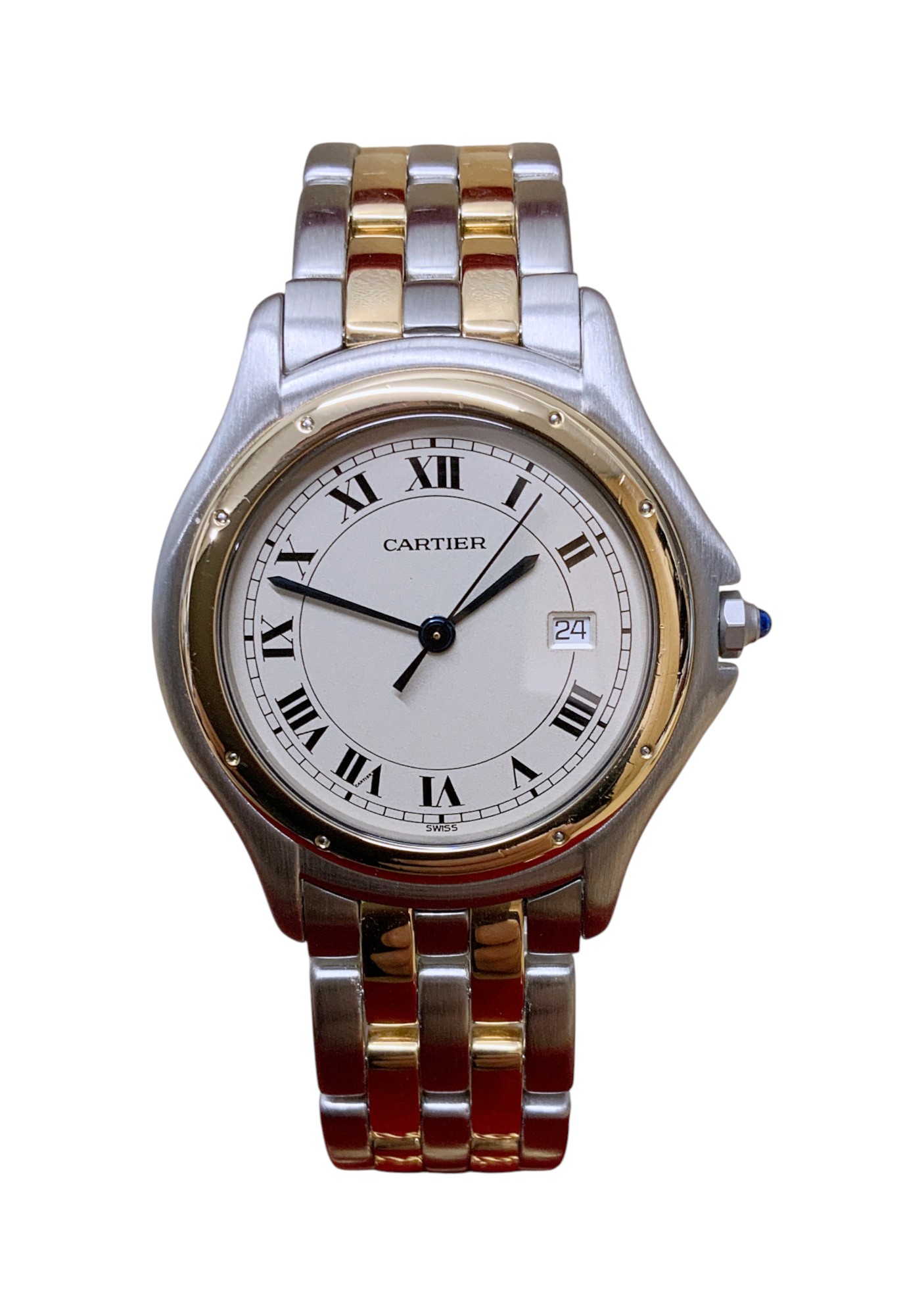 This Cartier Cougar W35006B6 has a silver roman numeral dial and a bracelet strap. This Cartier has undergone a thorough inspection of accuracy, functionality and condition at our Cartier certified service centre to determine the level of reconditioning required to meet our strict standards. It has also been checked against our records to ensure authenticity. Our watches have a 24-month warranty for your peace of mind, in conjunction with any remaining manufacturer’s warranty from new or from service.