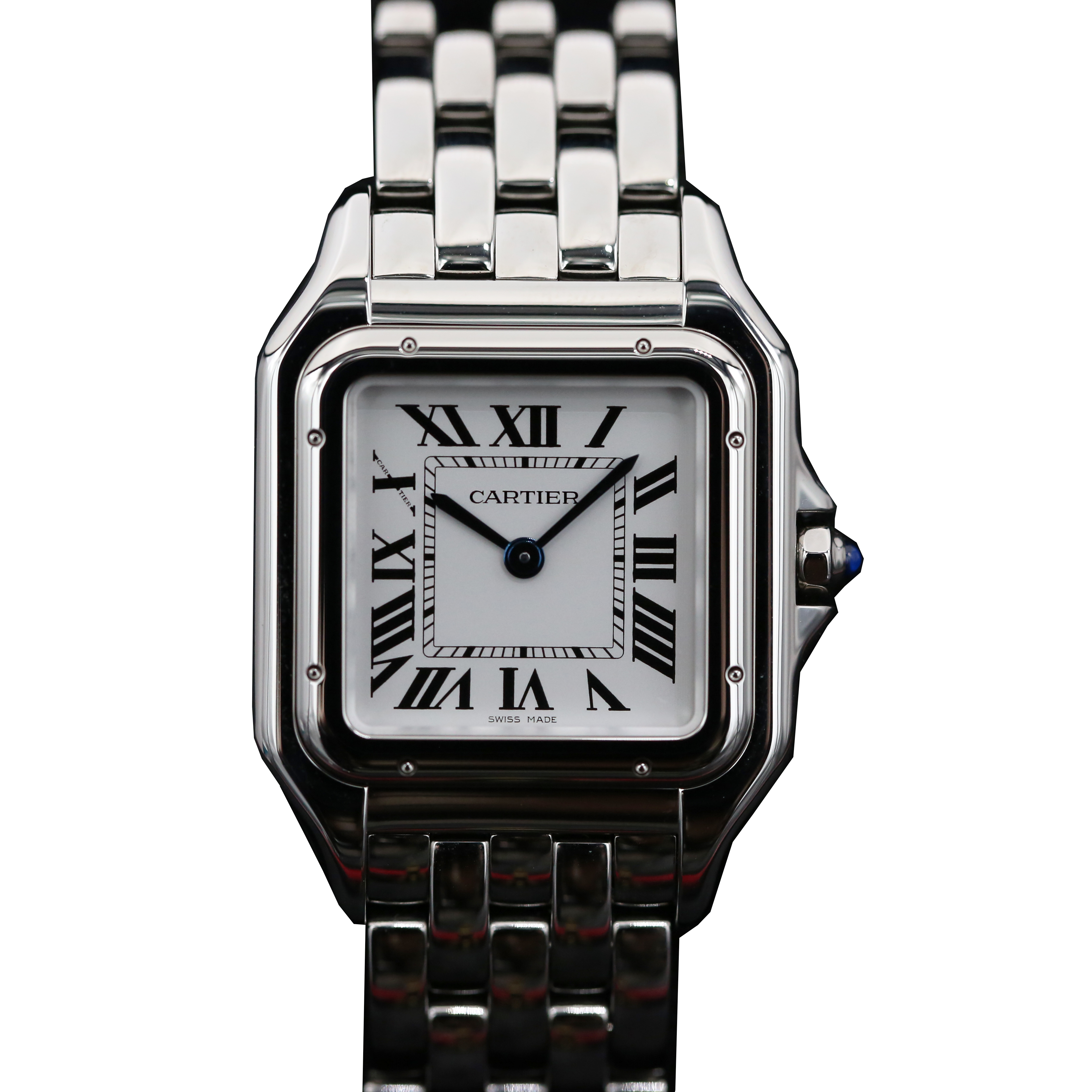 This Cartier Panthere De Cartier WSPN0015 has a silver roman numeral dial and a bracelet strap. This Cartier has undergone a thorough inspection of accuracy, functionality and condition at our Cartier certified service centre to determine the level of reconditioning required to meet our strict standards. It has also been checked against our records to ensure authenticity. Our watches have a 24-month warranty for your peace of mind, in conjunction with any remaining manufacturer’s warranty from new or from service.