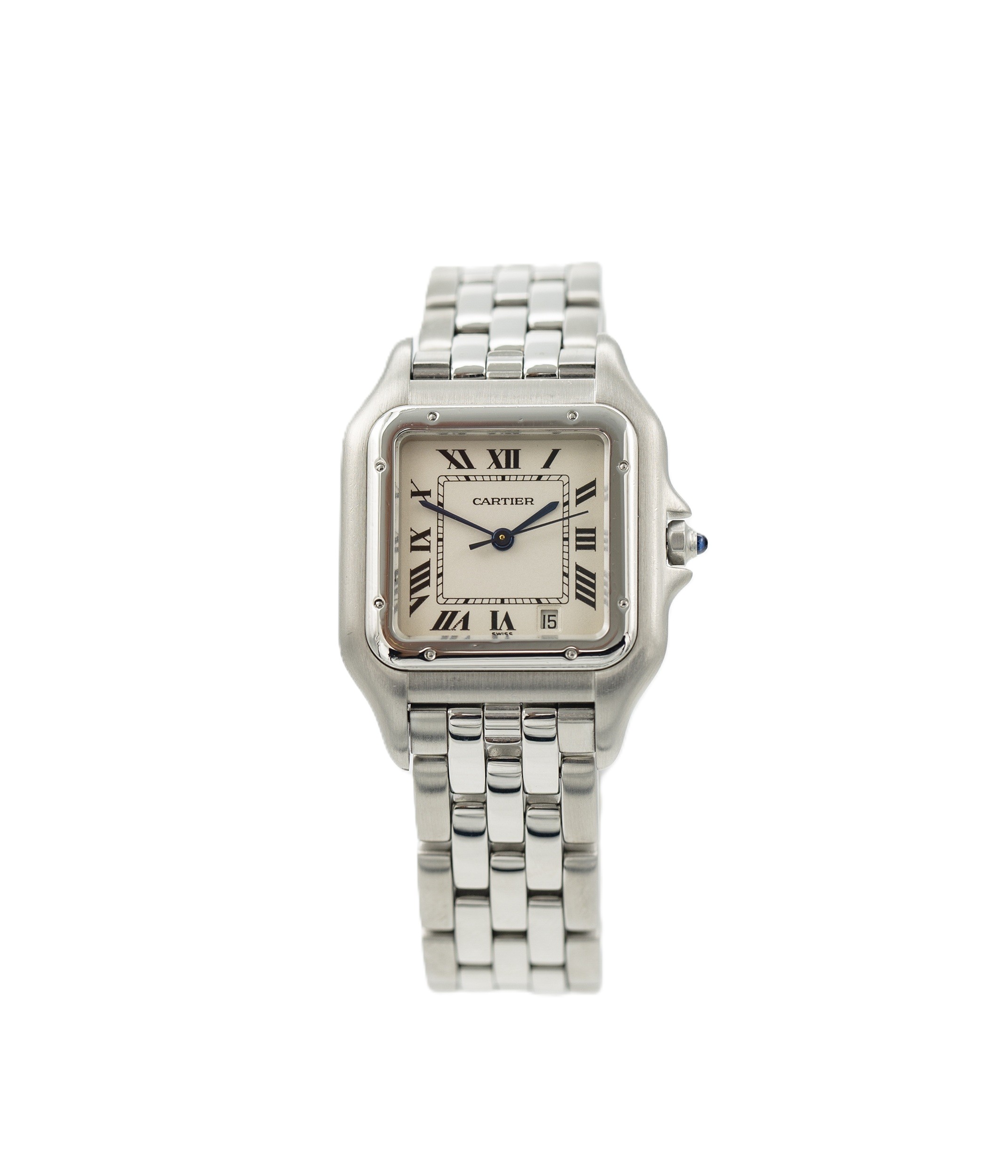 This Cartier Panthere W25054P5 has a white roman numeral dial and a bracelet strap. This Cartier has undergone a thorough inspection of accuracy, functionality and condition at our Cartier certified service centre to determine the level of reconditioning required to meet our strict standards. It has also been checked against our records to ensure authenticity. All our watches have a 24-month warranty for your peace of mind.