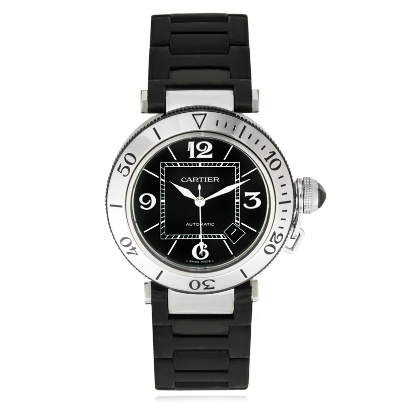 This Cartier Pasha W31077U2 has a black quarter arabic dial and a rubber strap. This Cartier has undergone a thorough inspection of accuracy, functionality and condition at our Cartier certified service centre to determine the level of reconditioning required to meet our strict standards. It has also been checked against our records to ensure authenticity. All our watches have a 24-month warranty for your peace of mind.