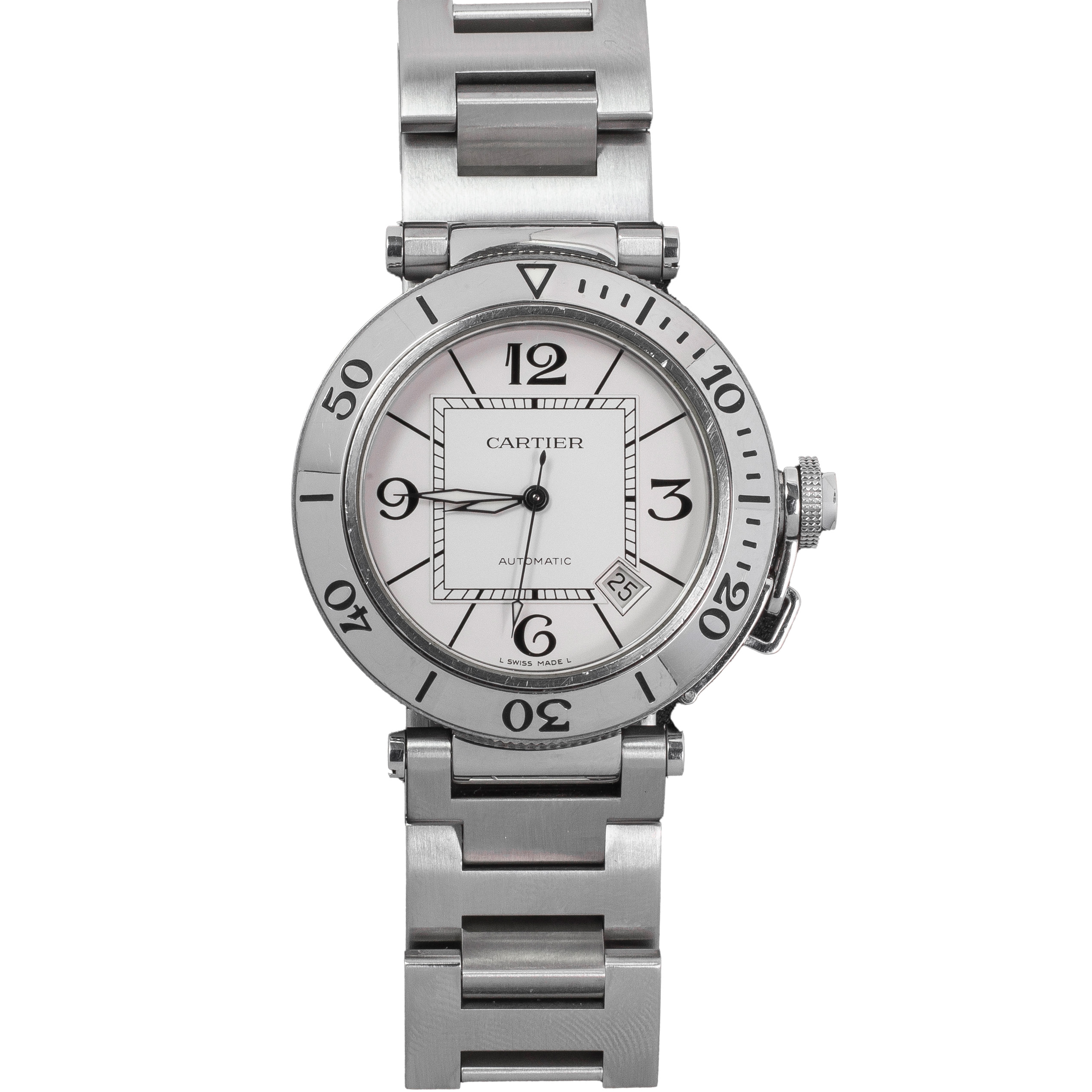 This Cartier Pasha W31080M7 has a silver quarter arabic dial and a bracelet strap. This Cartier has undergone a thorough inspection of accuracy, functionality and condition at our Cartier certified service centre to determine the level of reconditioning required to meet our strict standards. It has also been checked against our records to ensure authenticity. All our watches have a 24-month warranty for your peace of mind.