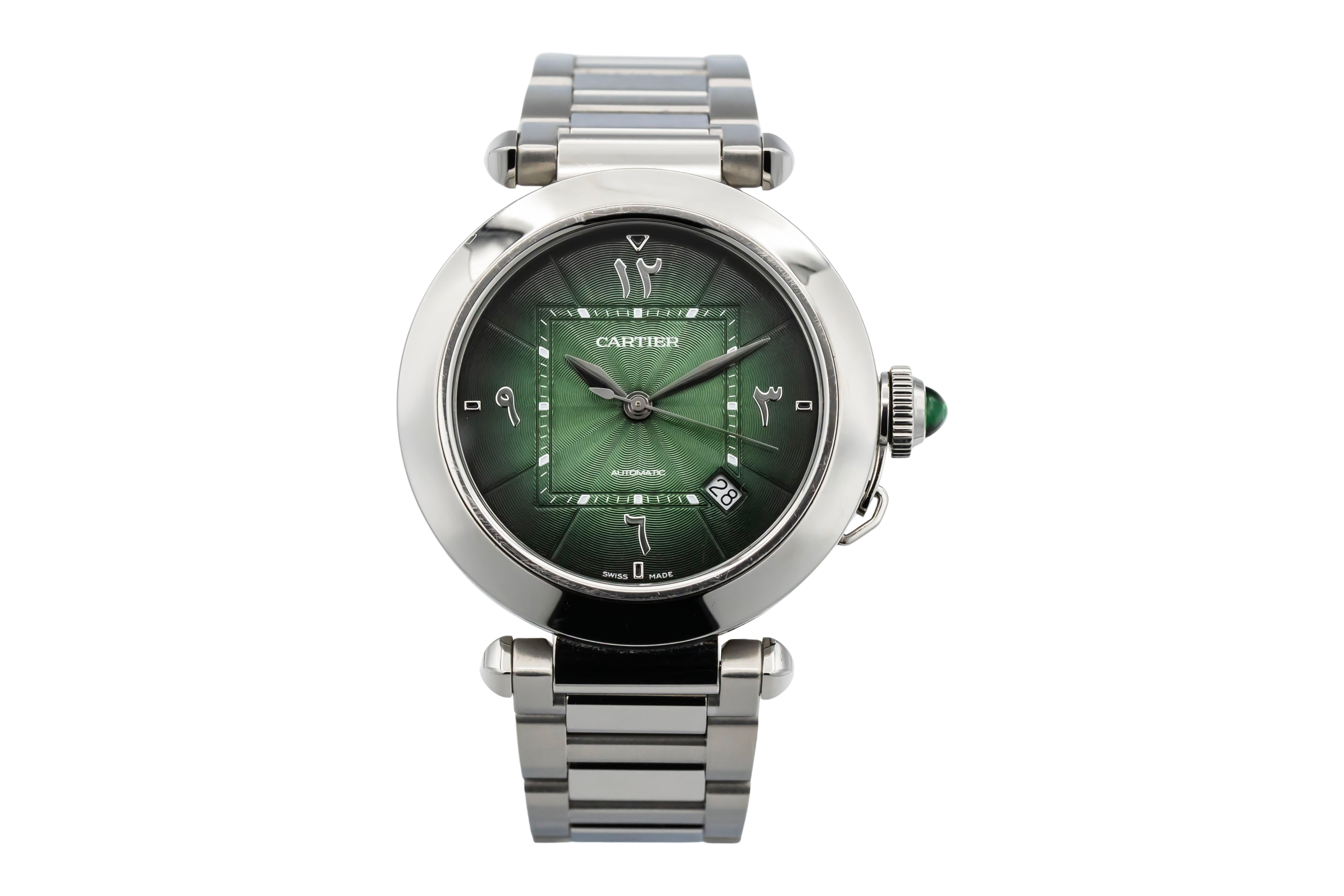 This Cartier Pasha WSPA0022 has a green dial and a bracelet strap. This Cartier has undergone a thorough inspection of accuracy, functionality and condition at our Cartier certified service centre to determine the level of reconditioning required to meet our strict standards. It has also been checked against our records to ensure authenticity. All our watches have a 24-month warranty for your peace of mind.