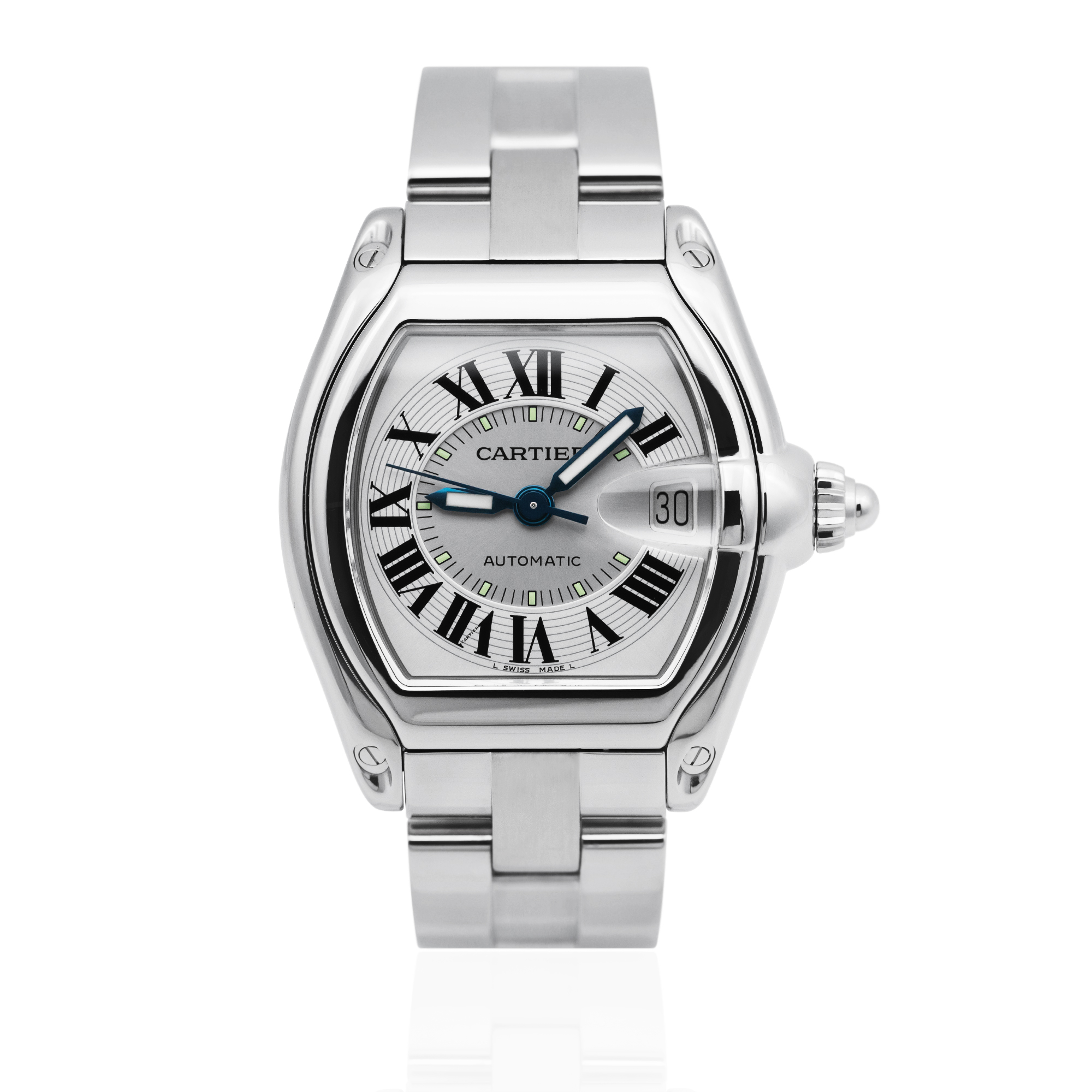 This Cartier Roadster W62000V3 has a silver roman numeral dial and a bracelet strap. This Cartier has undergone a thorough inspection of accuracy, functionality and condition at our Cartier certified service centre to determine the level of reconditioning required to meet our strict standards. It has also been checked against our records to ensure authenticity. All our watches have a 24-month warranty for your peace of mind.