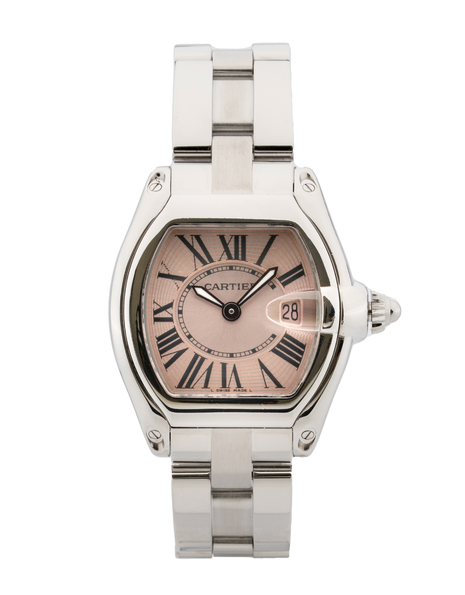 This Cartier Roadster W62017V3 has a pink roman numeral dial and a bracelet strap. This Cartier has undergone a thorough inspection of accuracy, functionality and condition at our Cartier certified service centre to determine the level of reconditioning required to meet our strict standards. It has also been checked against our records to ensure authenticity. All our watches have a 24-month warranty for your peace of mind.