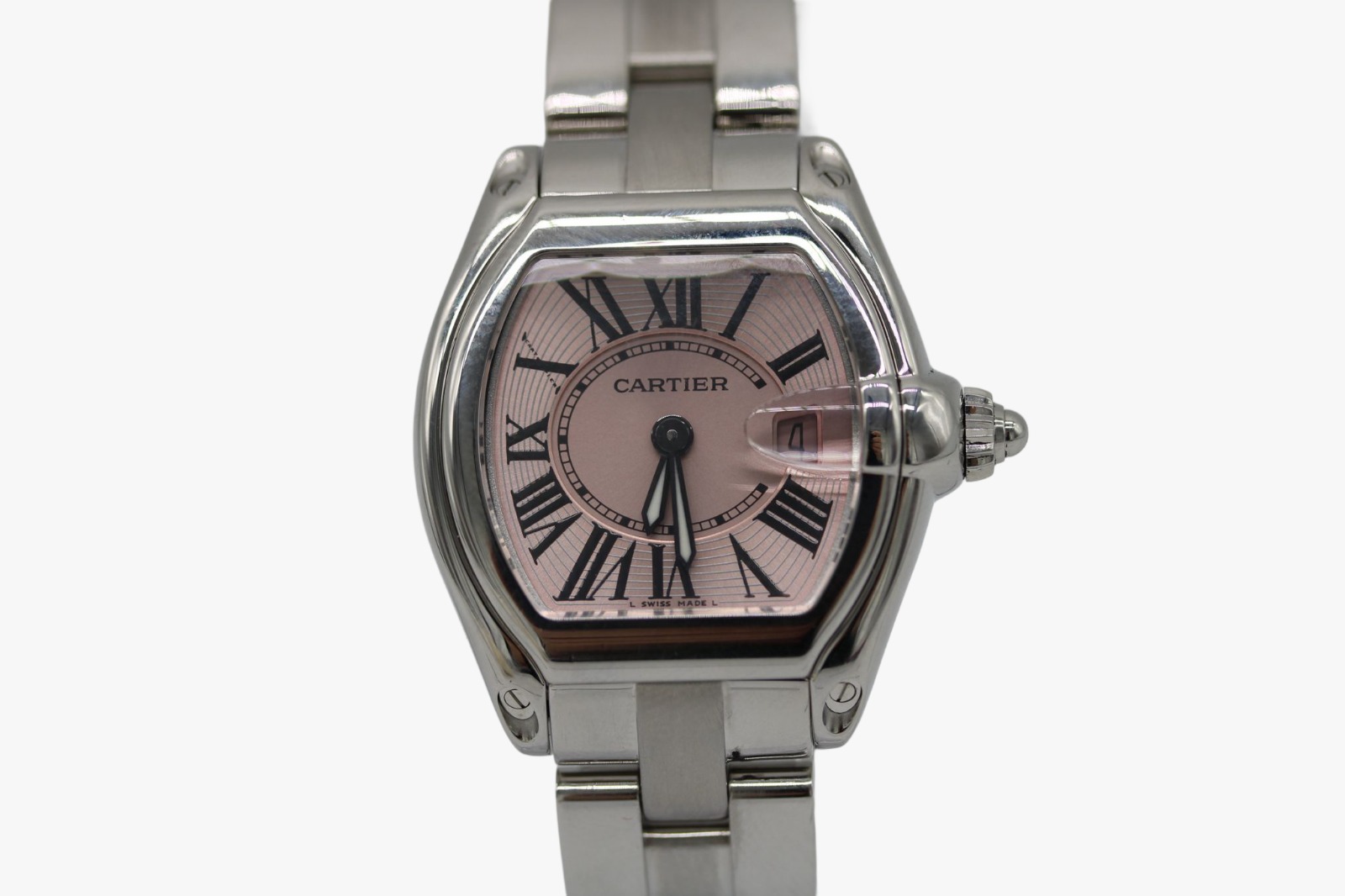This Cartier Roadster W62017V3 has a pink roman numeral dial and a bracelet strap. This Cartier has undergone a thorough inspection of accuracy, functionality and condition at our Cartier certified service centre to determine the level of reconditioning required to meet our strict standards. It has also been checked against our records to ensure authenticity. All our watches have a 24-month warranty for your peace of mind.