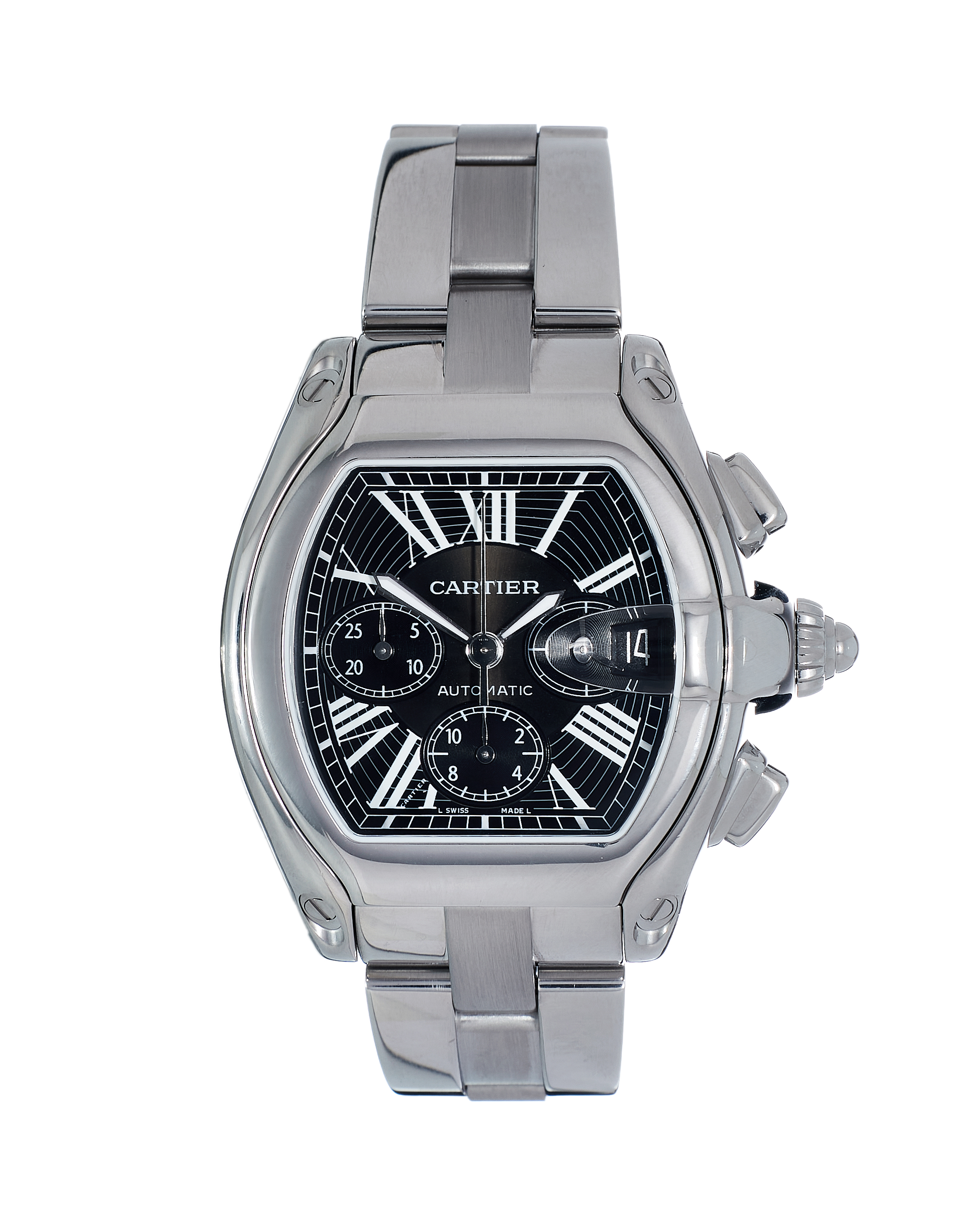 This Cartier Roadster W62020X6 has a black roman numeral dial and a bracelet strap. This Cartier has undergone a thorough inspection of accuracy, functionality and condition at our Cartier certified service centre to determine the level of reconditioning required to meet our strict standards. It has also been checked against our records to ensure authenticity. Our watches have a 24-month warranty for your peace of mind, in conjunction with any remaining manufacturer’s warranty from new or from service.