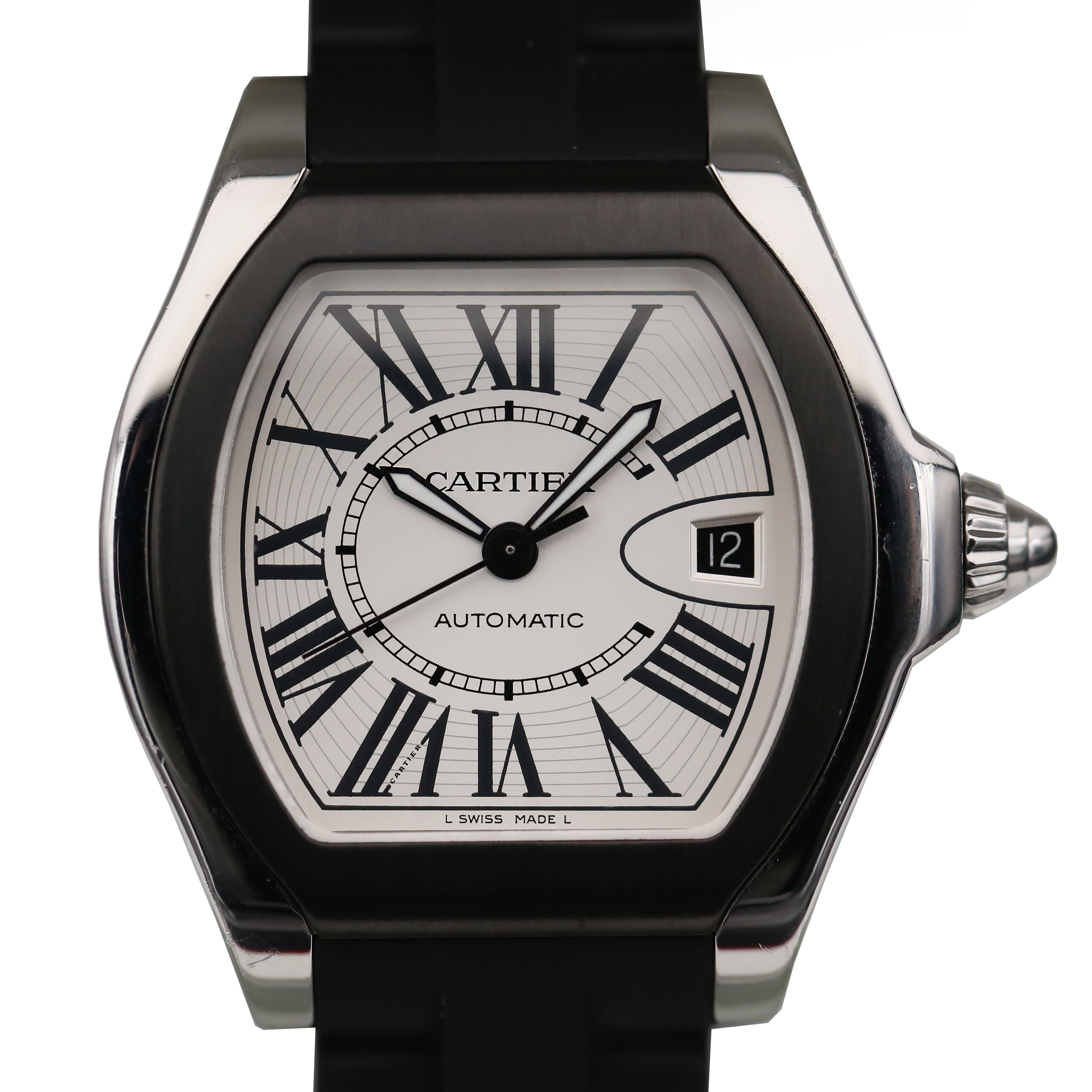 This Cartier Roadster W6206018 has a silver roman numeral dial and a rubber strap. This Cartier has undergone a thorough inspection of accuracy, functionality and condition at our Cartier certified service centre to determine the level of reconditioning required to meet our strict standards. It has also been checked against our records to ensure authenticity. All our watches have a 24-month warranty for your peace of mind.