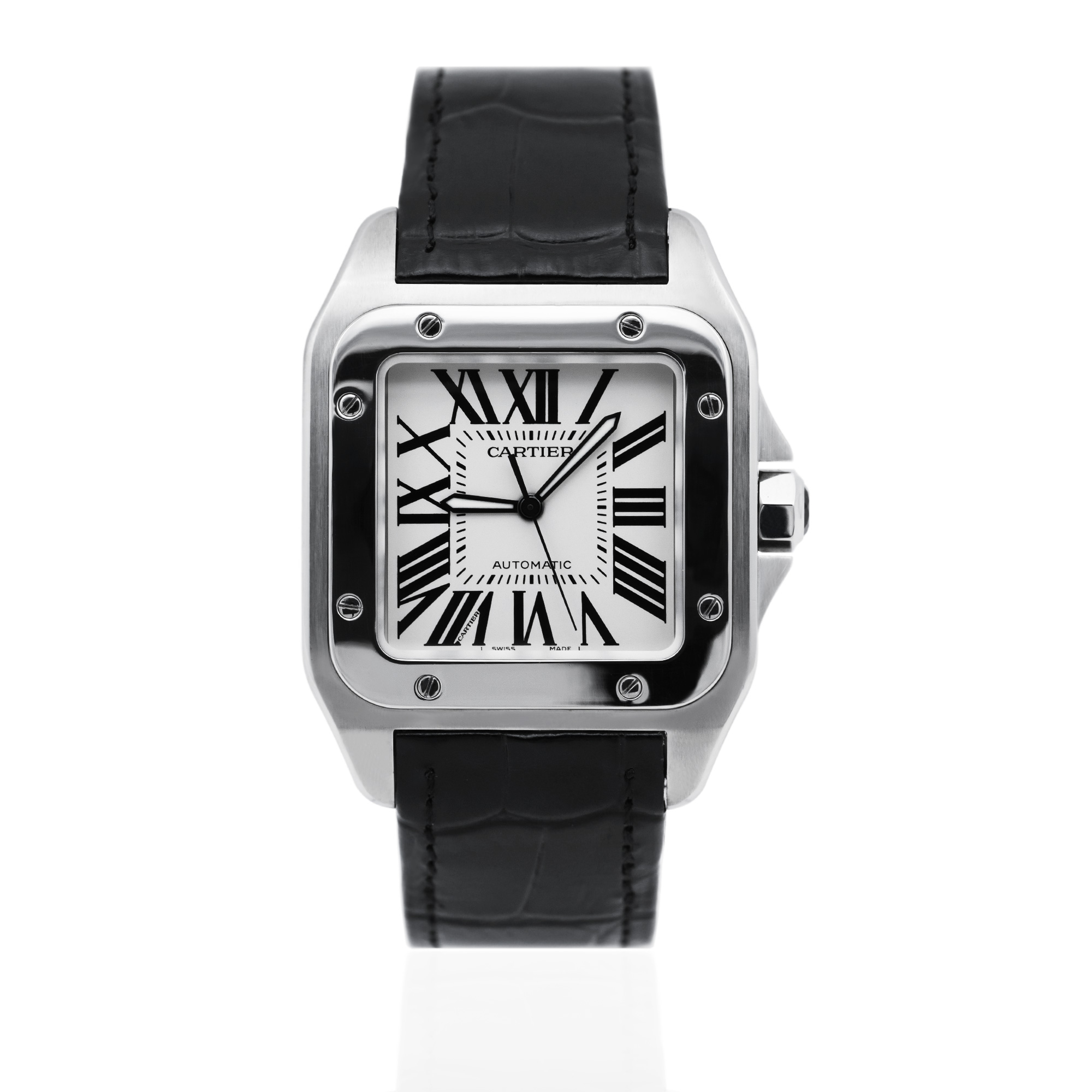 This Cartier Santos 100 W20073X8 has a silver roman numeral dial and a leather strap. This Cartier has undergone a thorough inspection of accuracy, functionality and condition at our Cartier certified service centre to determine the level of reconditioning required to meet our strict standards. It has also been checked against our records to ensure authenticity. All our watches have a 24-month warranty for your peace of mind.