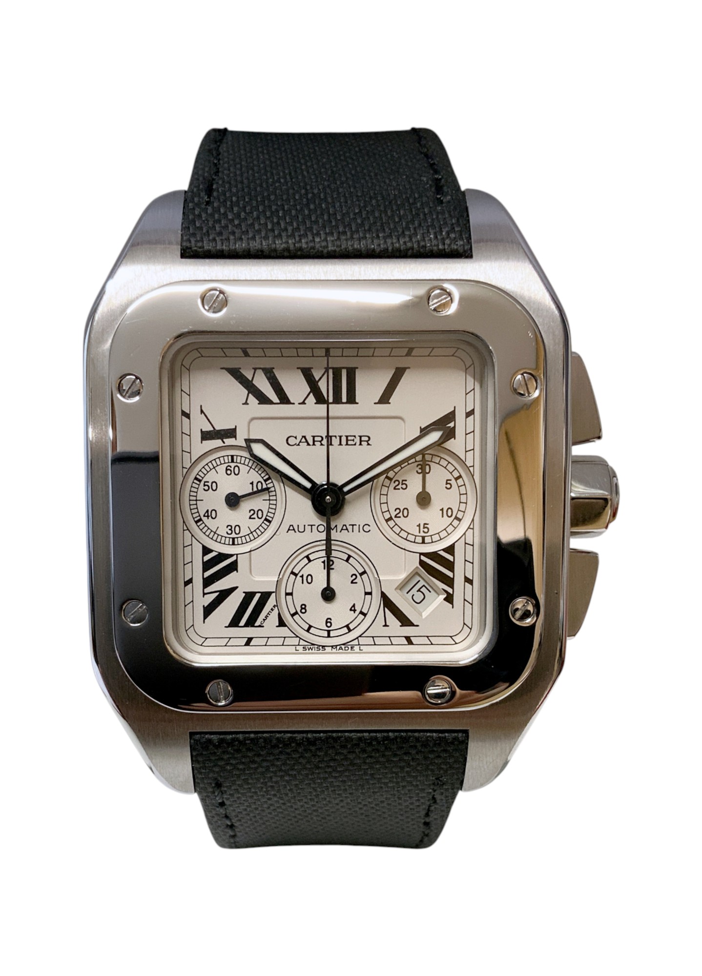 This Cartier Santos 100 W20090X8 has a silver roman numeral dial and a leather strap. This Cartier has undergone a thorough inspection of accuracy, functionality and condition at our Cartier certified service centre to determine the level of reconditioning required to meet our strict standards. It has also been checked against our records to ensure authenticity. Our watches have a 24-month warranty for your peace of mind, in conjunction with any remaining manufacturer’s warranty from new or from service.