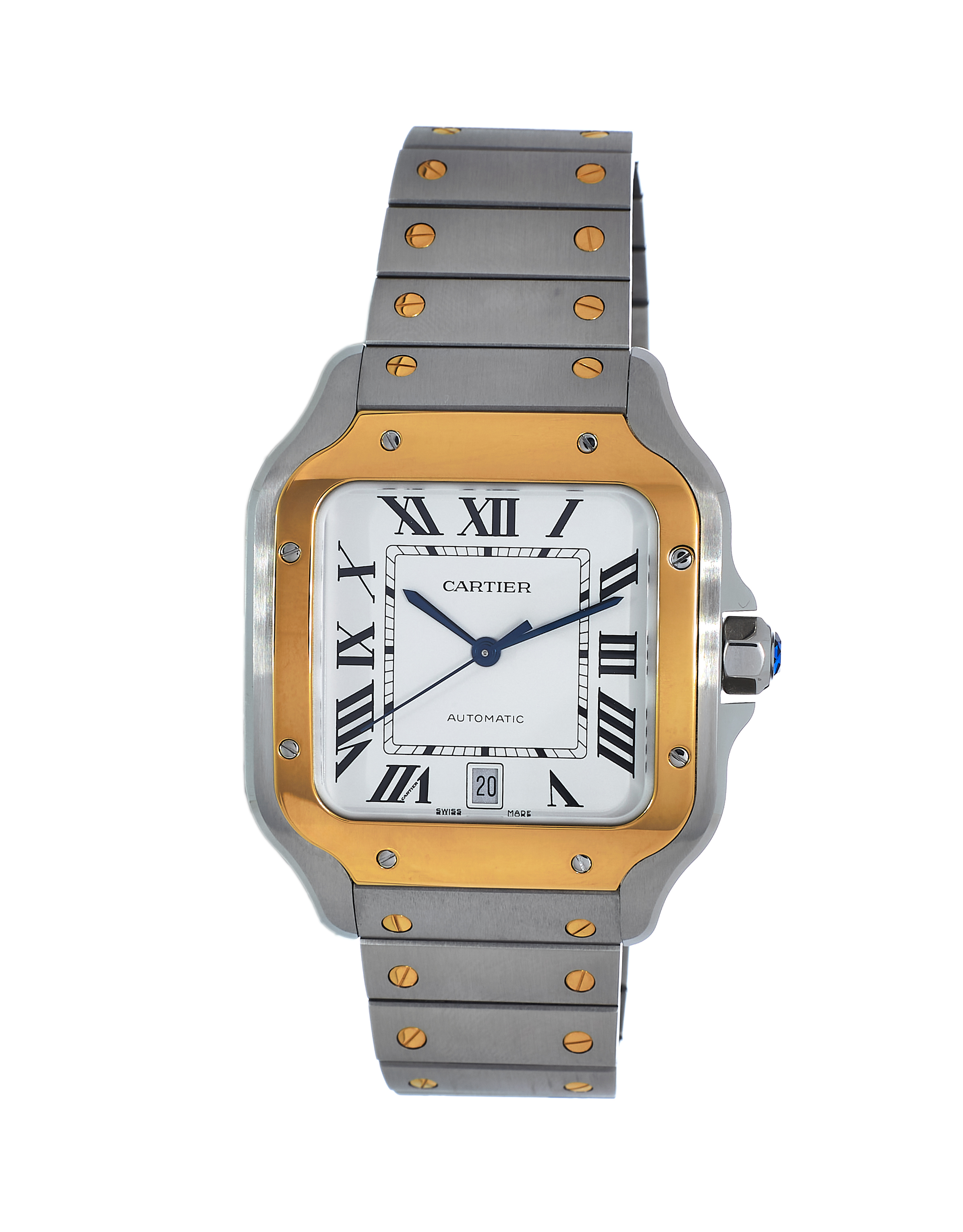 This Cartier Santos De Cartier W2SA0009 has a silver roman numeral dial and a bracelet strap. This Cartier has undergone a thorough inspection of accuracy, functionality and condition at our Cartier certified service centre to determine the level of reconditioning required to meet our strict standards. It has also been checked against our records to ensure authenticity. Our watches have a 24-month warranty for your peace of mind, in conjunction with any remaining manufacturer’s warranty from new or from service.