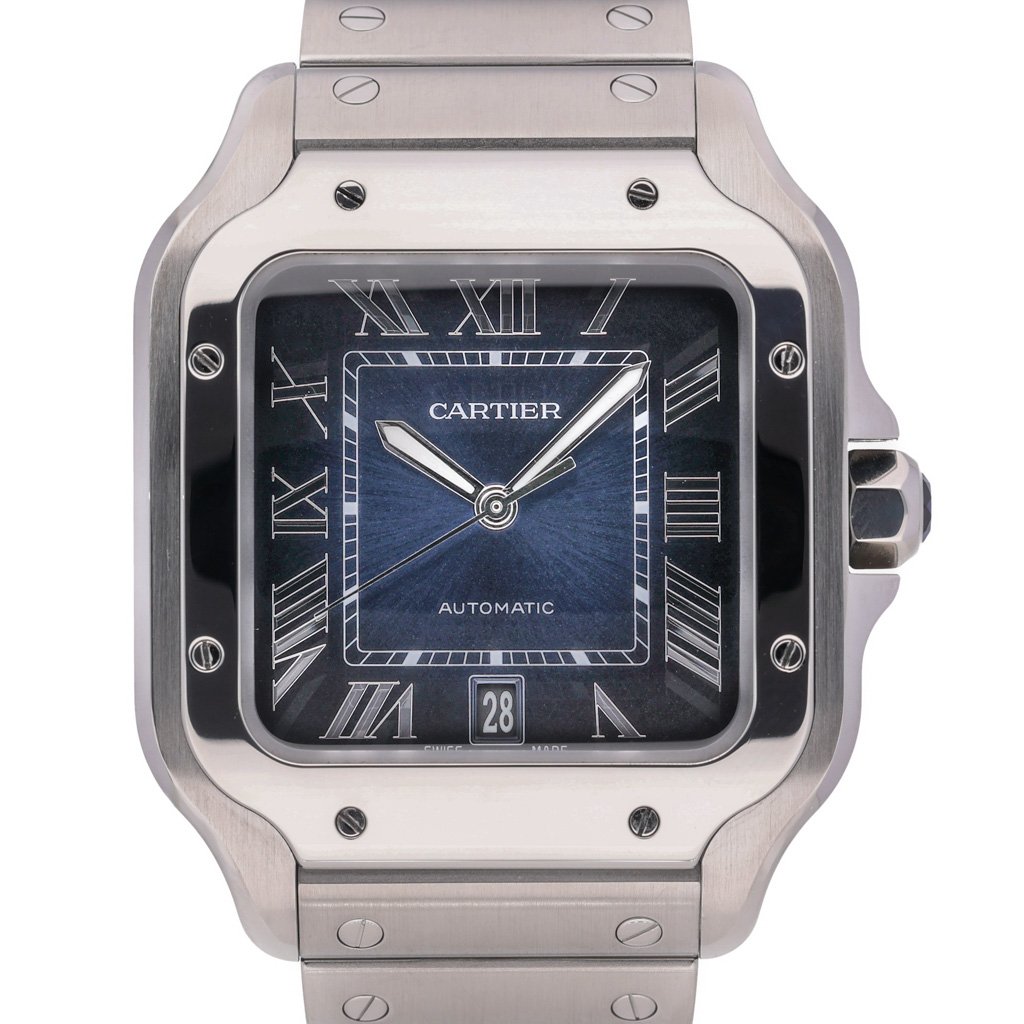 This Cartier Santos De Cartier WSSA0030 has a blue roman numeral dial and a bracelet strap. This Cartier has undergone a thorough inspection of accuracy, functionality and condition at our Cartier certified service centre to determine the level of reconditioning required to meet our strict standards. It has also been checked against our records to ensure authenticity. All our watches have a 24-month warranty for your peace of mind.
