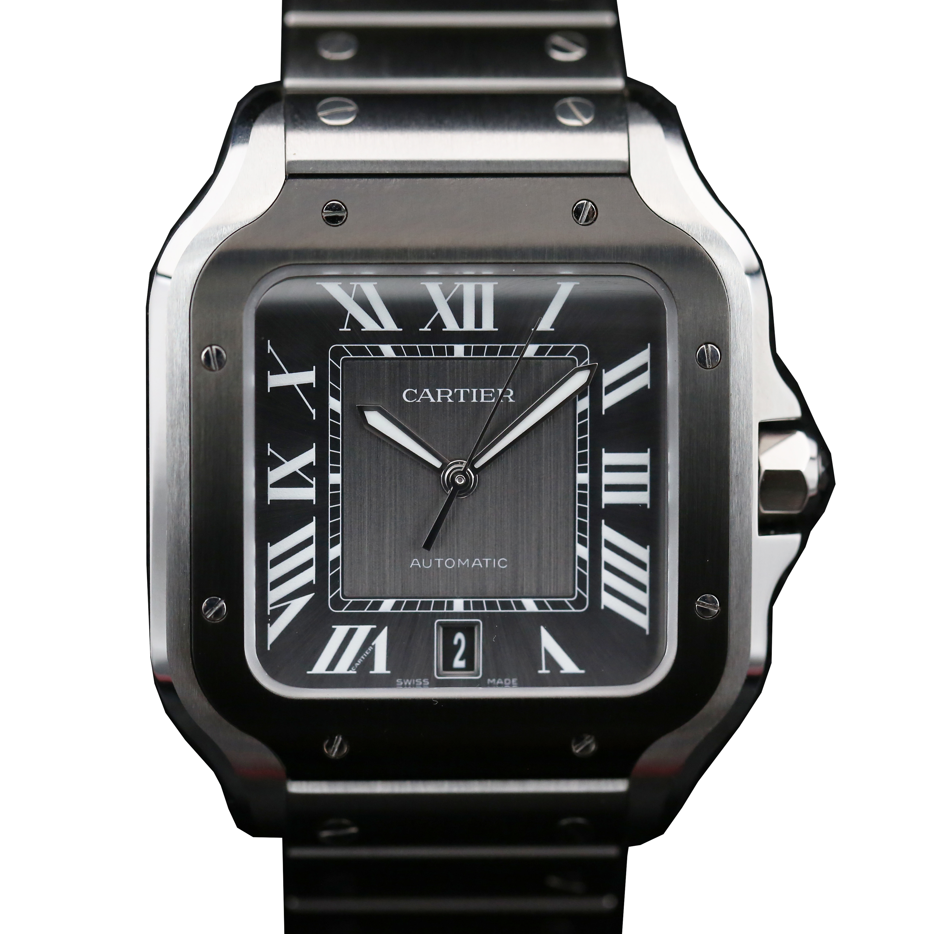 This Cartier Santos De Cartier WSSA0037 has a grey roman numeral dial and a bracelet strap. This Cartier has undergone a thorough inspection of accuracy, functionality and condition at our Cartier certified service centre to determine the level of reconditioning required to meet our strict standards. It has also been checked against our records to ensure authenticity. Our watches have a 24-month warranty for your peace of mind, in conjunction with any remaining manufacturer’s warranty from new or from service.