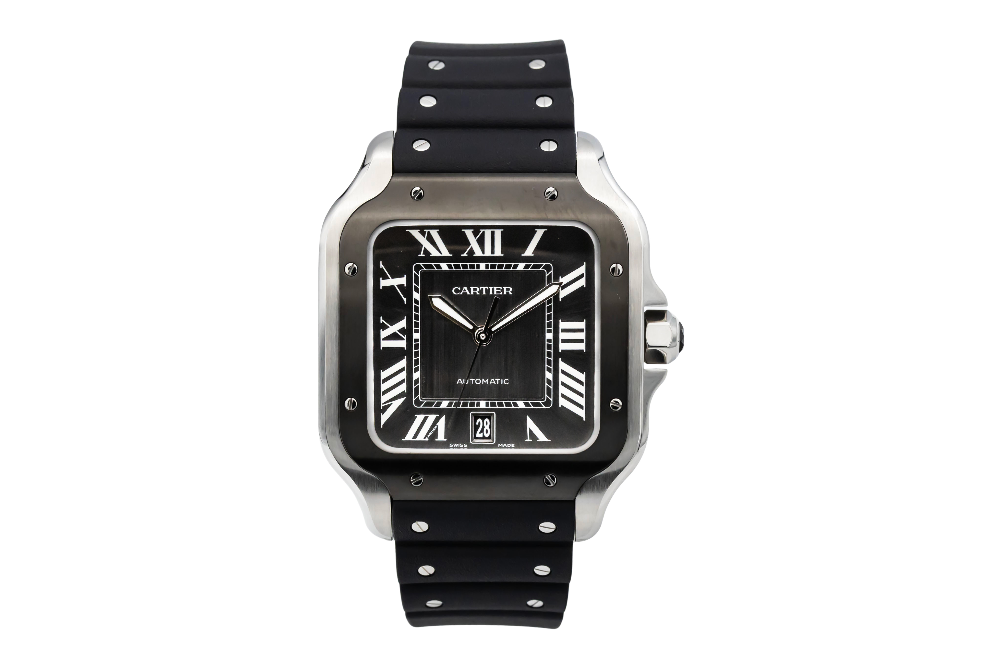 This Cartier Santos De Cartier WSSA0037 has a grey roman numeral dial and a rubber strap. This Cartier has undergone a thorough inspection of accuracy, functionality and condition at our Cartier certified service centre to determine the level of reconditioning required to meet our strict standards. It has also been checked against our records to ensure authenticity. All our watches have a 24-month warranty for your peace of mind.