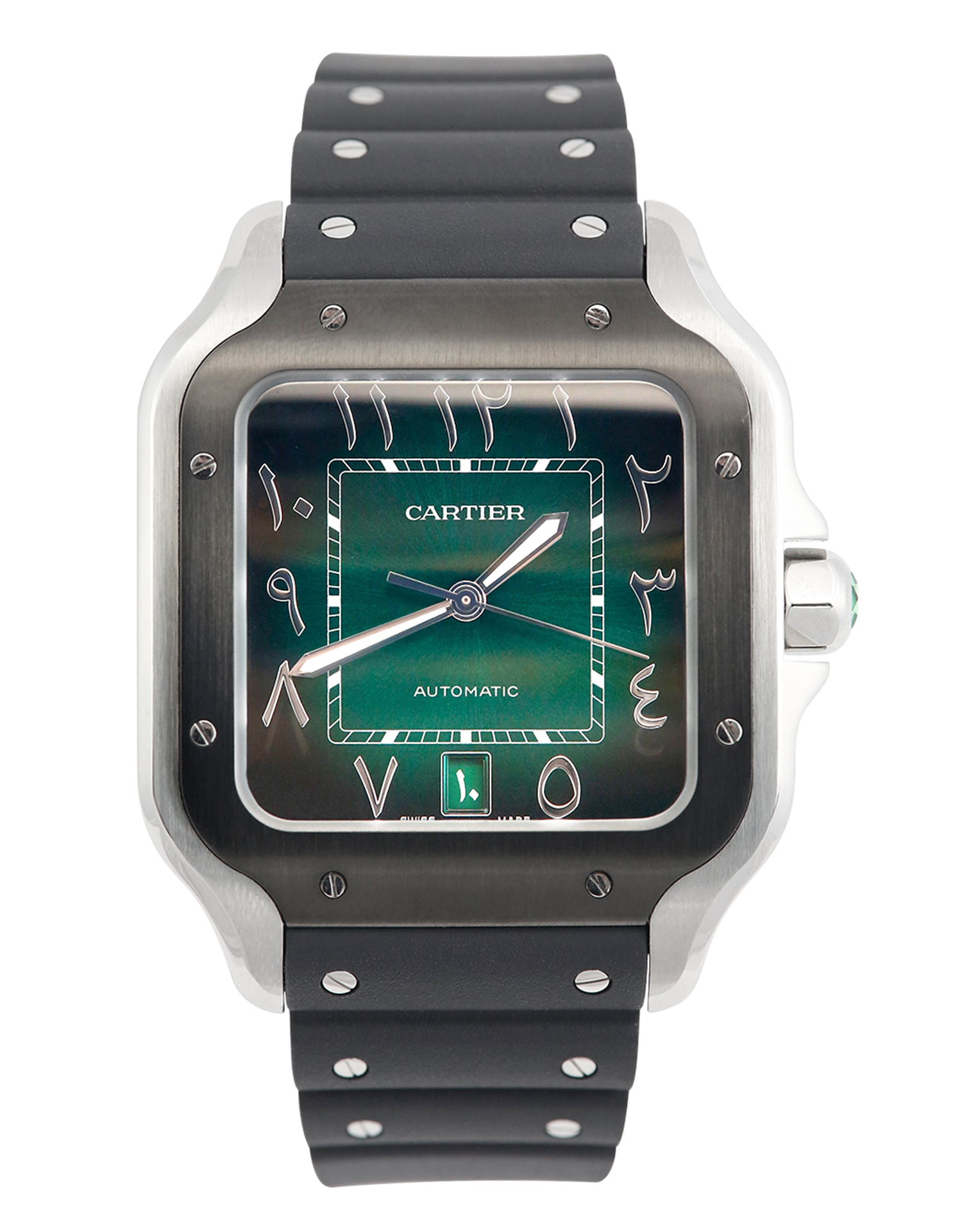 This Cartier Santos De Cartier WSSA0055 has a green arabic script dial and a rubber strap. This Cartier has undergone a thorough inspection of accuracy, functionality and condition at our Cartier certified service centre to determine the level of reconditioning required to meet our strict standards. It has also been checked against our records to ensure authenticity. Our watches have a 24-month warranty for your peace of mind, in conjunction with any remaining manufacturer’s warranty from new or from service.