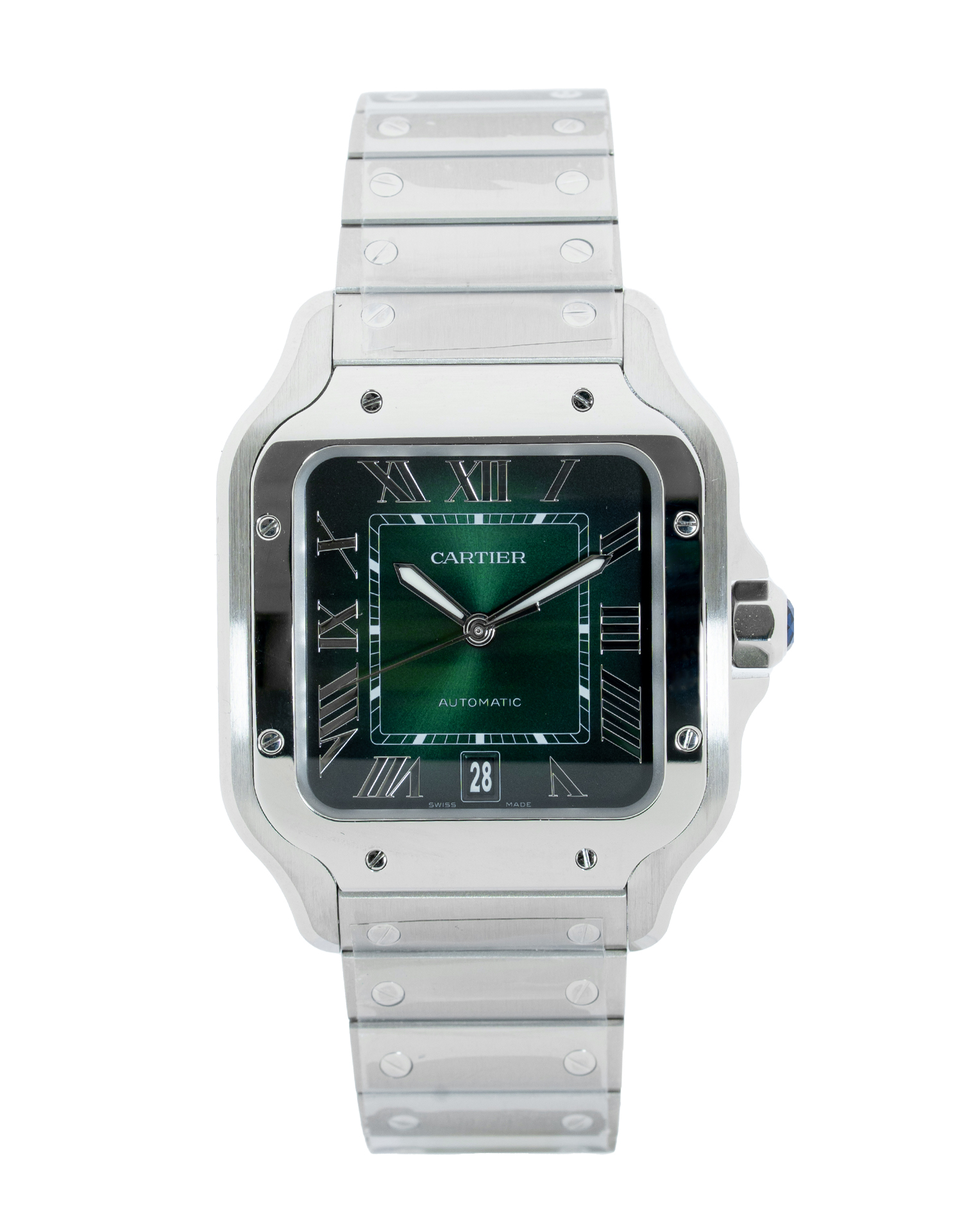 This Cartier Santos De Cartier WSSA0062 has a green roman numeral dial and a bracelet strap. This Cartier has undergone a thorough inspection of accuracy, functionality and condition at our Cartier certified service centre to determine the level of reconditioning required to meet our strict standards. It has also been checked against our records to ensure authenticity. Our watches have a 24-month warranty for your peace of mind, in conjunction with any remaining manufacturer’s warranty from new or from service.