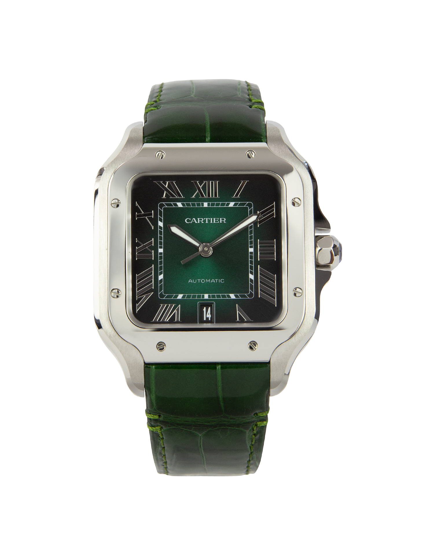 This Cartier Santos De Cartier WSSA0062 has a green roman numeral dial and a bracelet strap. This Cartier has undergone a thorough inspection of accuracy, functionality and condition at our Cartier certified service centre to determine the level of reconditioning required to meet our strict standards. It has also been checked against our records to ensure authenticity. Our watches have a 24-month warranty for your peace of mind, in conjunction with any remaining manufacturer’s warranty from new or from service.