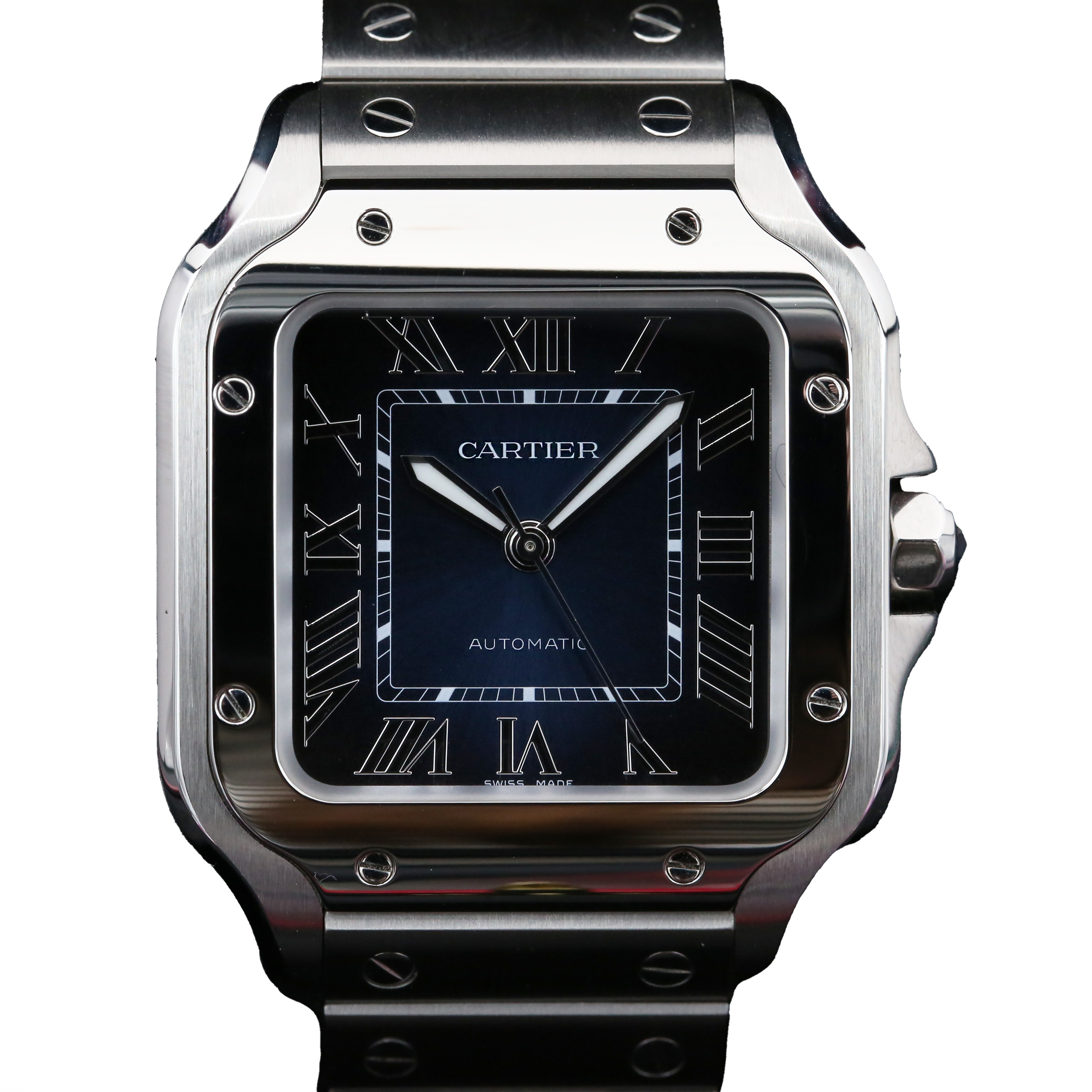 This Cartier Santos De Cartier WSSA0063 has a blue roman numeral dial and a bracelet strap. This Cartier has undergone a thorough inspection of accuracy, functionality and condition at our Cartier certified service centre to determine the level of reconditioning required to meet our strict standards. It has also been checked against our records to ensure authenticity. Our watches have a 24-month warranty for your peace of mind, in conjunction with any remaining manufacturer’s warranty from new or from service.