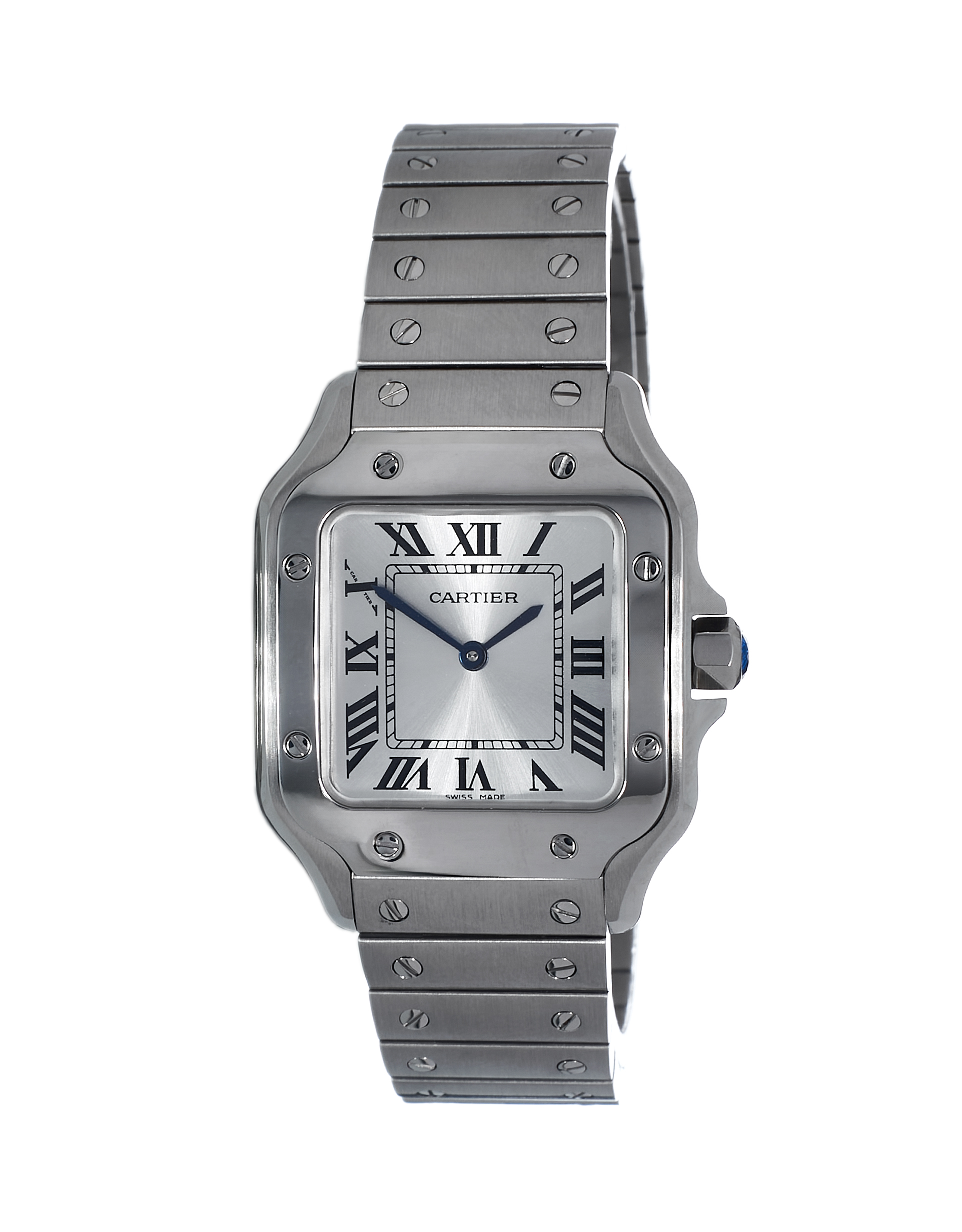 This Cartier Santos De Cartier WSSA0082 has a silver roman numeral dial and a bracelet strap. This Cartier has undergone a thorough inspection of accuracy, functionality and condition at our Cartier certified service centre to determine the level of reconditioning required to meet our strict standards. It has also been checked against our records to ensure authenticity. Our watches have a 24-month warranty for your peace of mind, in conjunction with any remaining manufacturer’s warranty from new or from service.
