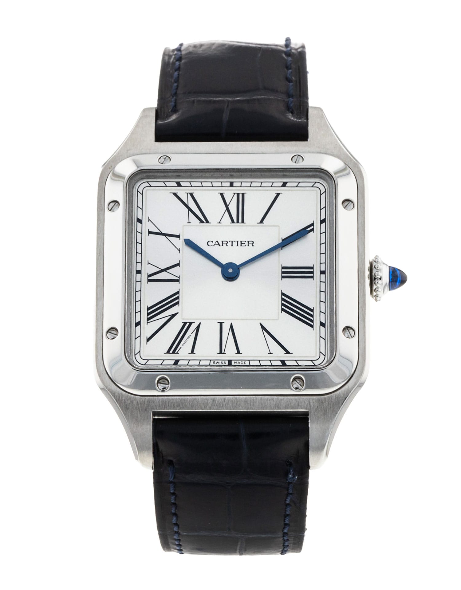 This Cartier Santos Dumont WSSA0022 has a silver roman numeral dial and a leather strap. This Cartier has undergone a thorough inspection of accuracy, functionality and condition at our Cartier certified service centre to determine the level of reconditioning required to meet our strict standards. It has also been checked against our records to ensure authenticity. All our watches have a 24-month warranty for your peace of mind.