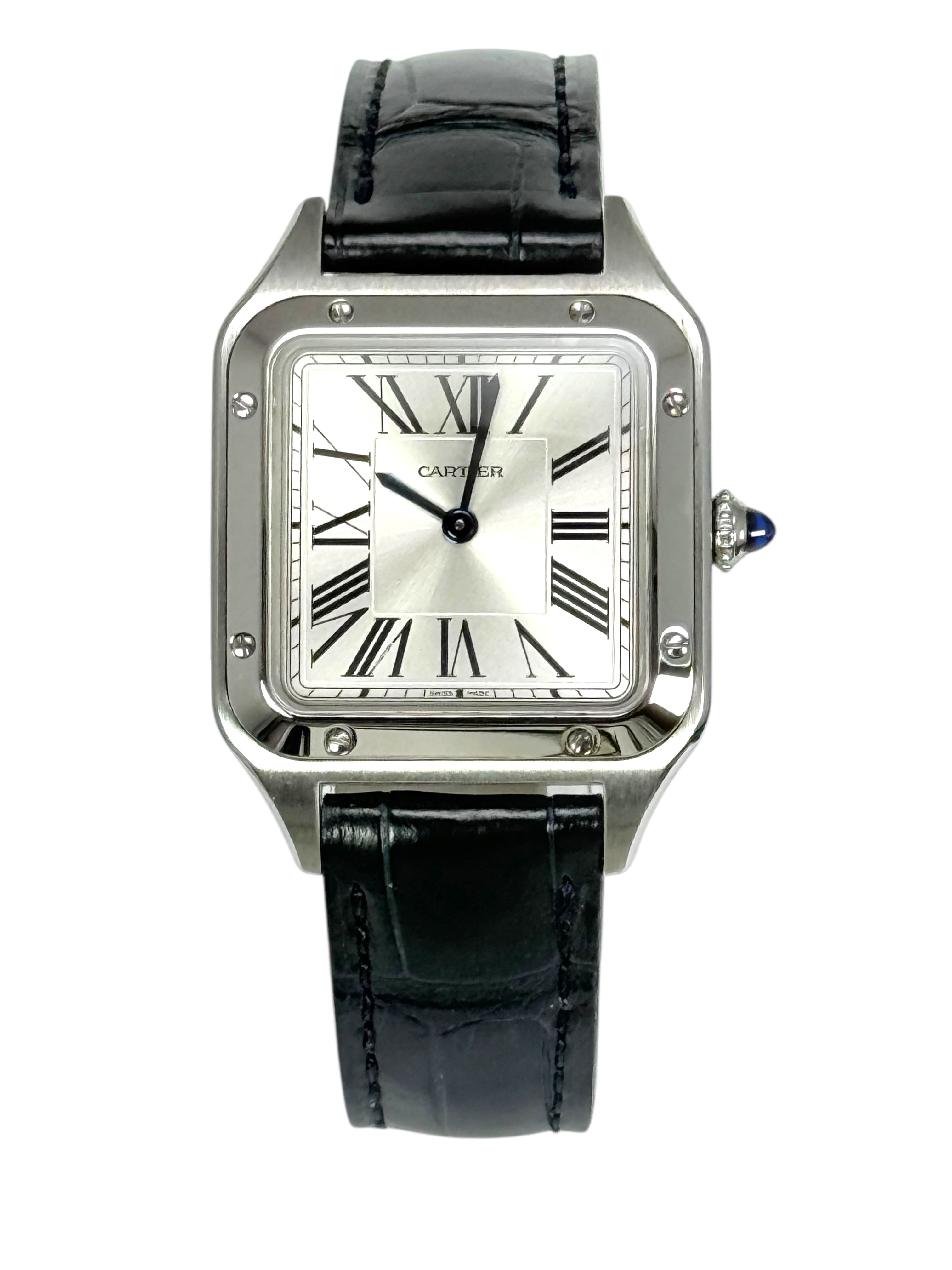 This Cartier Santos Dumont WSSA0023 has a silver roman numeral dial and a leather strap. This Cartier has undergone a thorough inspection of accuracy, functionality and condition at our Cartier certified service centre to determine the level of reconditioning required to meet our strict standards. It has also been checked against our records to ensure authenticity. All our watches have a 24-month warranty for your peace of mind.