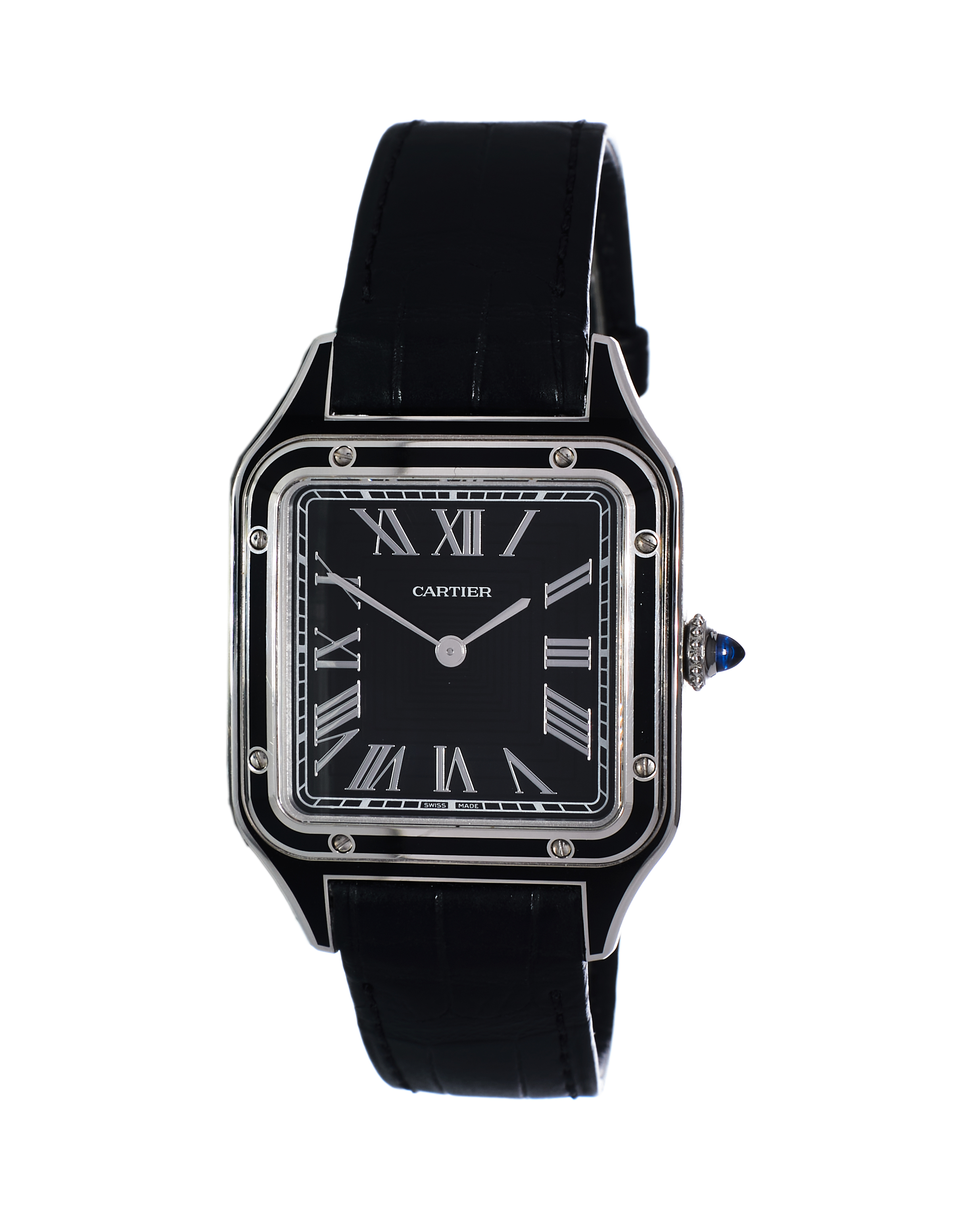 This Cartier Santos Dumont WSSA0046 has a black roman numeral dial and a leather strap. This Cartier has undergone a thorough inspection of accuracy, functionality and condition at our Cartier certified service centre to determine the level of reconditioning required to meet our strict standards. It has also been checked against our records to ensure authenticity. All our watches have a 24-month warranty for your peace of mind.