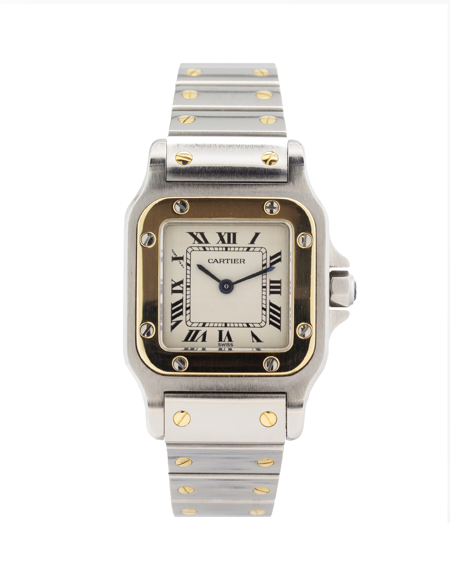 It was in 1904 that Louis Cartier gave a watch to his good friend and aviation pioneer Alberto Santos-Dumont that was designed to be worn on the wrist. The Santos watch was the first ever men's wristwatch, originally invented to make it easier to check the time while flying. It was a game-changer in the industry thanks to Santos-Dumont's huge popularity and fame, as well as a very early example of the iconic Art Deco style that would influence fashion and watchmaking for decades. The modern Santos watches maintain the classic hallmarks of the original, including the rounded square case, Roman numerals and fully incorporated lugs—as well as gorgeous golden elements in this model.