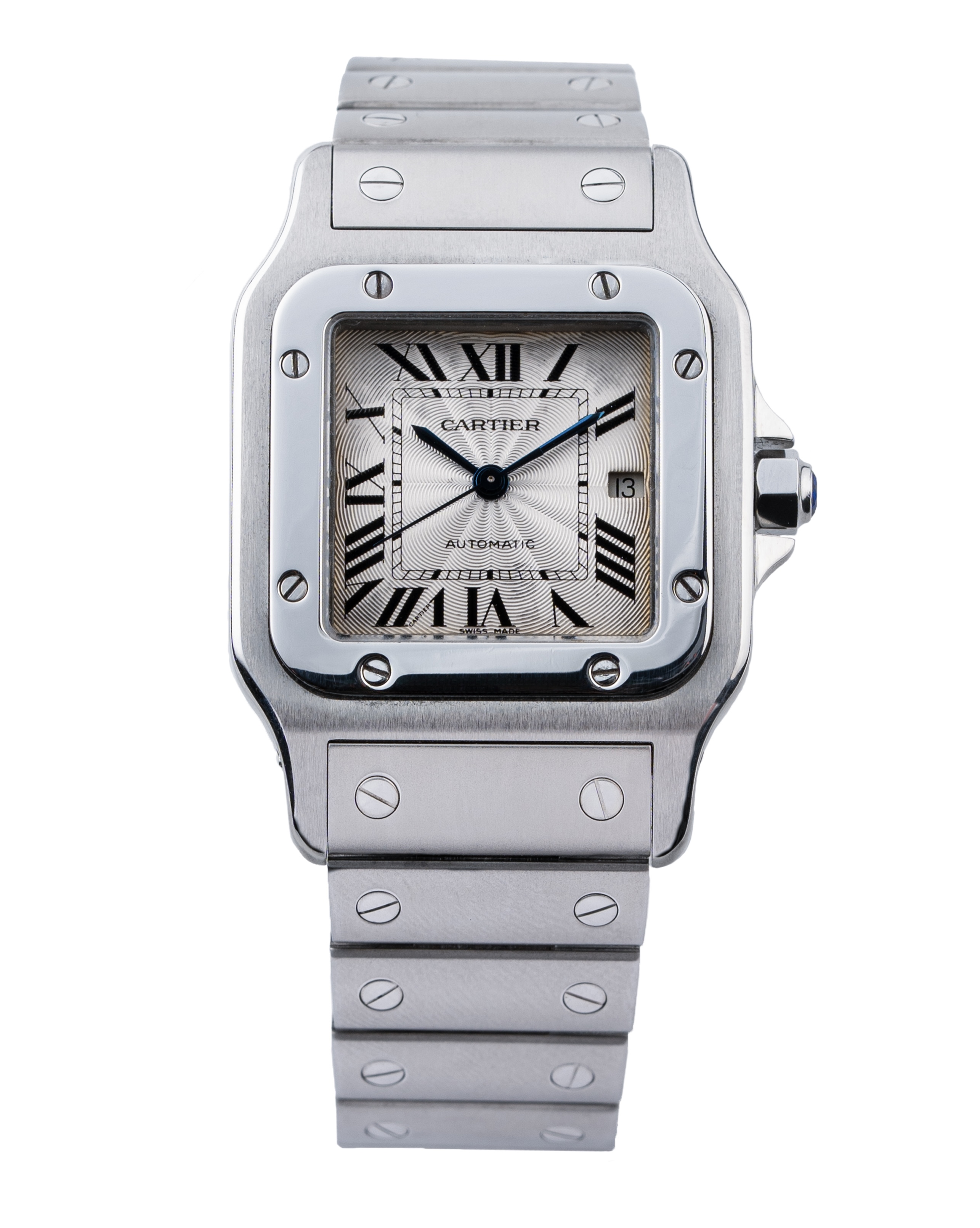 It was in 1904 that Louis Cartier gave a watch to his good friend and aviation pioneer Alberto Santos-Dumont that was designed to be worn on the wrist. The Santos watch was the first ever men's wristwatch, originally invented to make it easier to check the time while flying. It was a game-changer in the industry thanks to Santos-Dumont's huge popularity and fame, as well as a very early example of the iconic Art Deco style that would influence fashion and watchmaking for decades. The modern Santos watches maintain the classic hallmarks of the original, including the rounded square case, Roman numerals and fully incorporated lugs—as well as the stunning guilloché dial on this model.