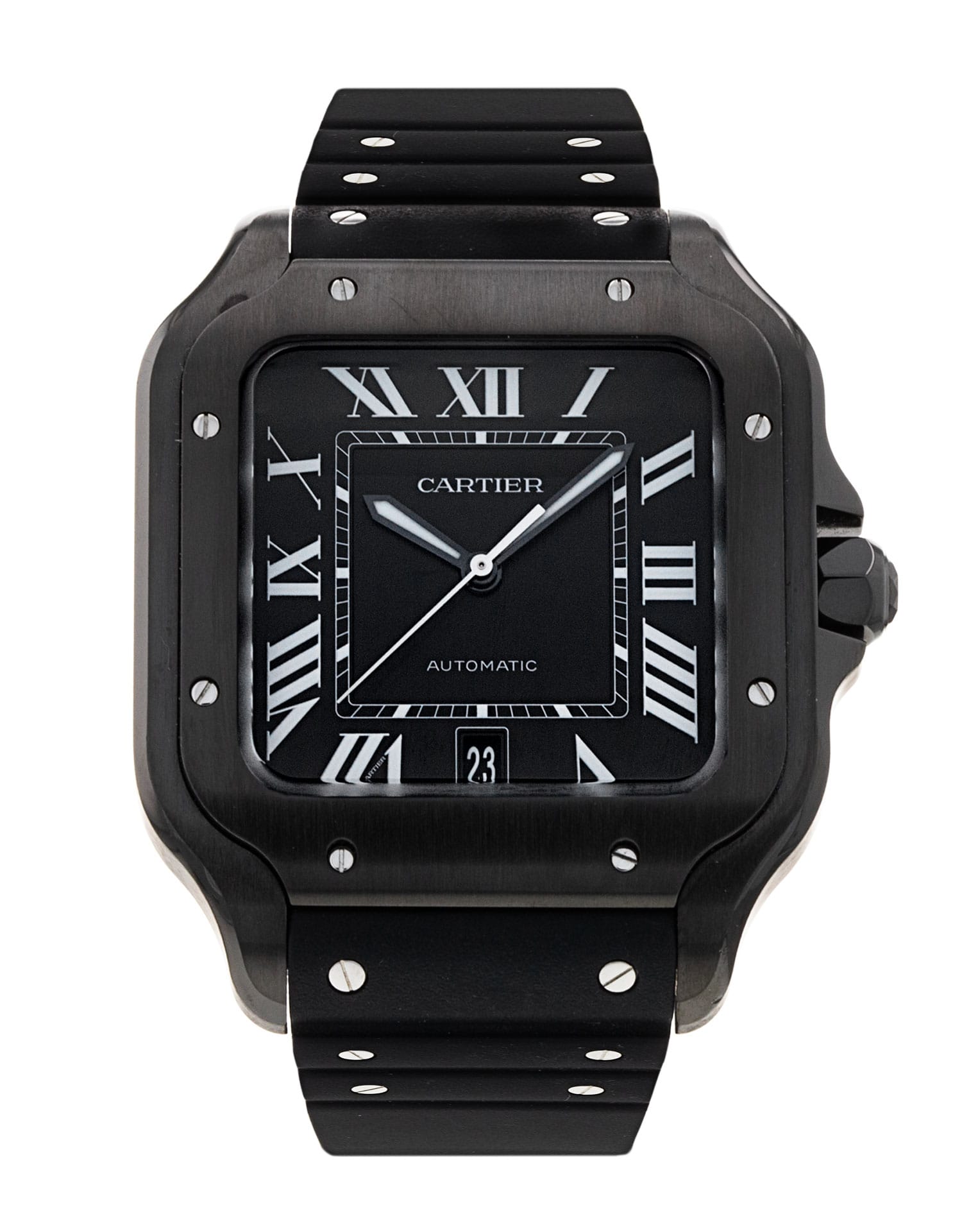 This Cartier Santos WSSA0039 has a black roman numeral dial and a rubber strap. This Cartier has undergone a thorough inspection of accuracy, functionality and condition at our Cartier certified service centre to determine the level of reconditioning required to meet our strict standards. It has also been checked against our records to ensure authenticity. Our watches have a 24-month warranty for your peace of mind, in conjunction with any remaining manufacturer’s warranty from new or from service.