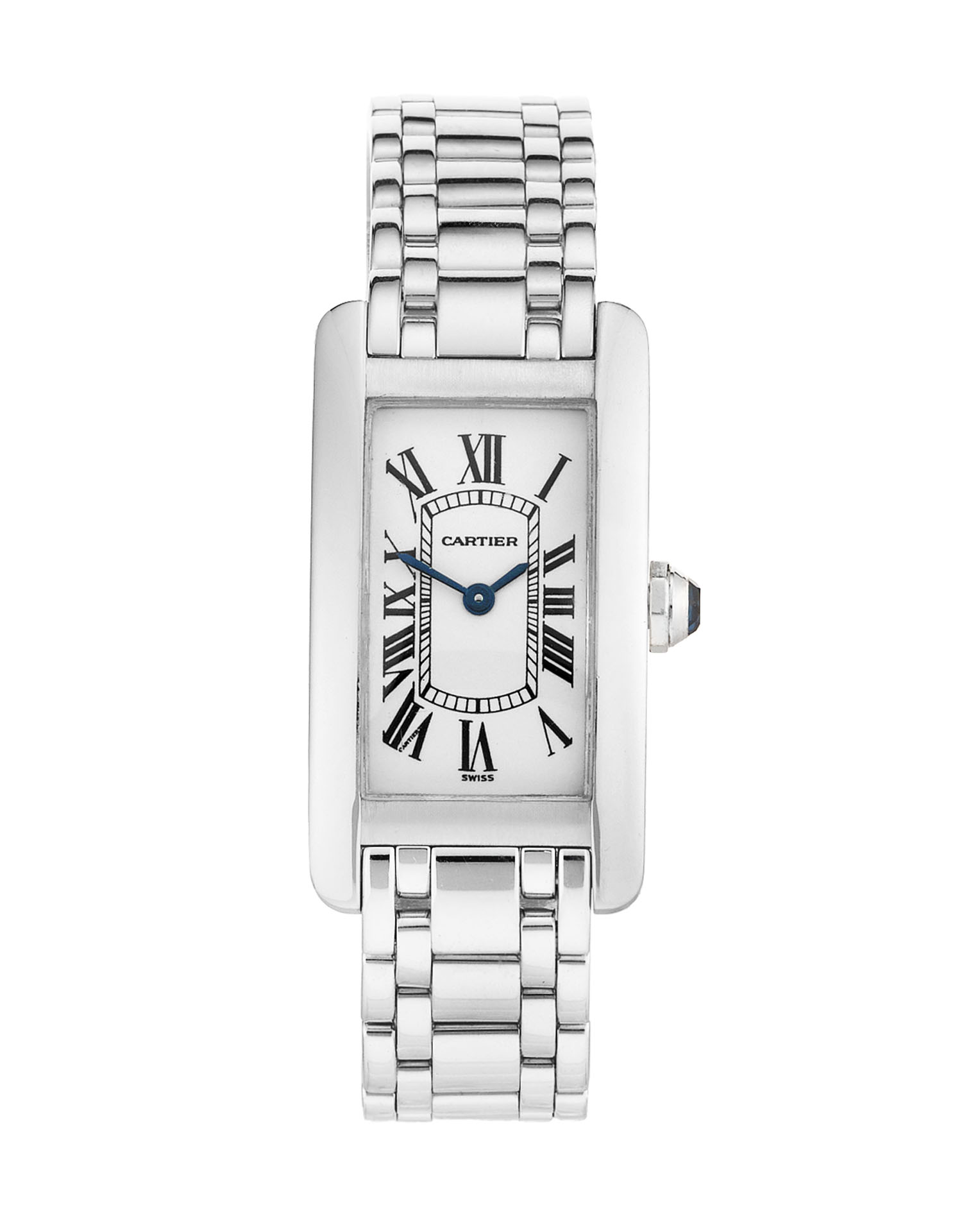 This Cartier Tank Americaine W26019L1 has a white roman numeral dial and a bracelet strap. This Cartier has undergone a thorough inspection of accuracy, functionality and condition at our Cartier certified service centre to determine the level of reconditioning required to meet our strict standards. It has also been checked against our records to ensure authenticity. All our watches have a 24-month warranty for your peace of mind.