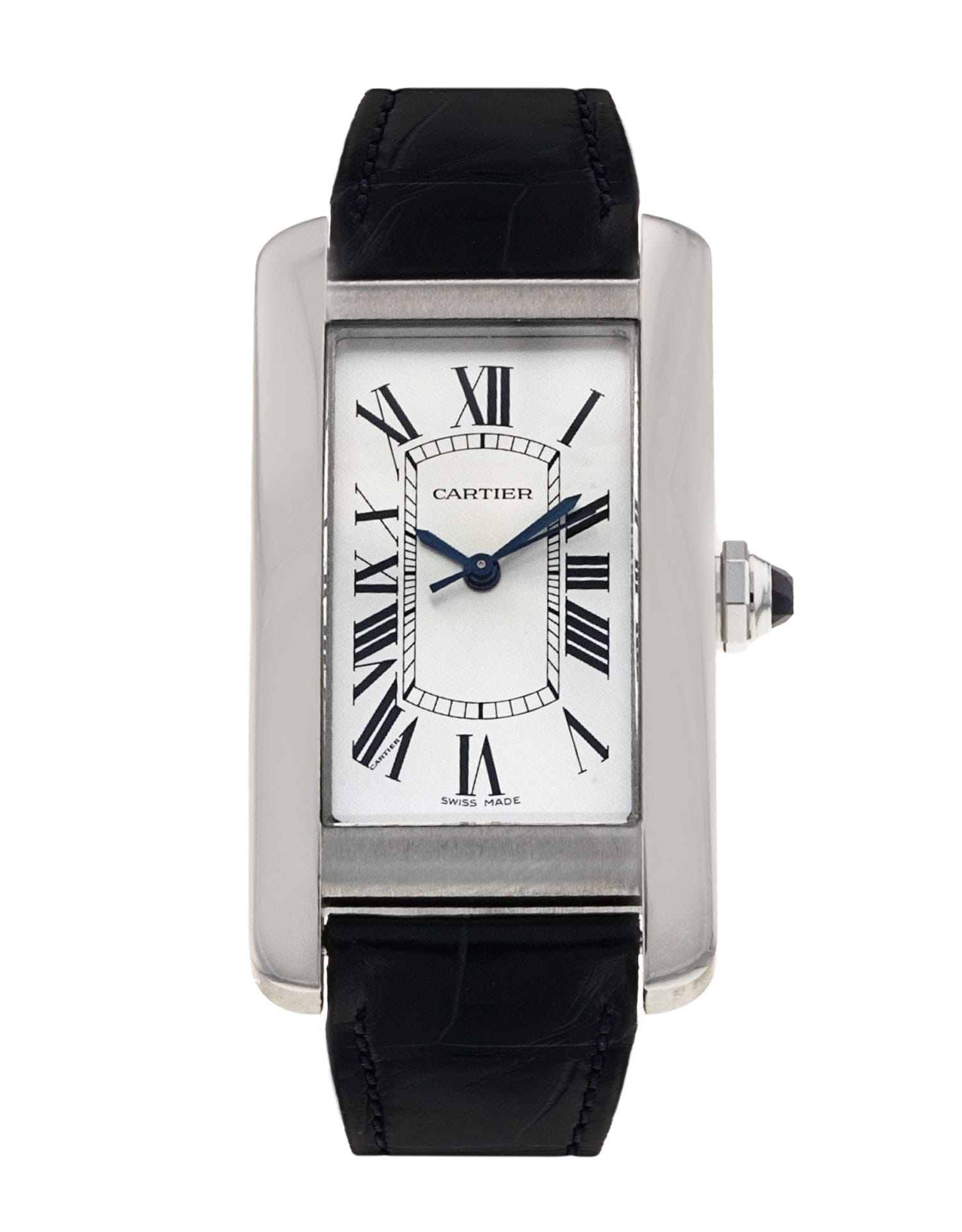 This Cartier Tank Americaine WSTA0044 has a silver roman numeral dial and a leather strap. This Cartier has undergone a thorough inspection of accuracy, functionality and condition at our Cartier certified service centre to determine the level of reconditioning required to meet our strict standards. It has also been checked against our records to ensure authenticity. Our watches have a 24-month warranty for your peace of mind, in conjunction with any remaining manufacturer’s warranty from new or from service.