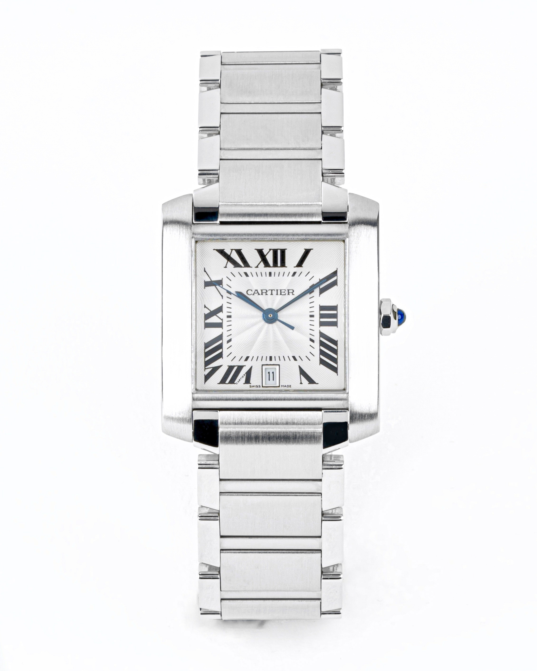 The Cartier Tank, inspired by an actual tank, has been a design milestone since its inception in the early 20th century. Unlike the modified pocket watches being made by other manufacturers, the Tank used a new case design that actually incorporated the lugs into its shape, rather than adding them as an afterthought. Other iconic design elements include the blued sword hands, Roman numerals, elegant square dial and octagonal crown complete with sapphire cabochon. The Française collection adds a somewhat sportier, more modern feel to an already superb timepiece, making it bolder and more versatile, in large part thanks to its chain-link bracelet.