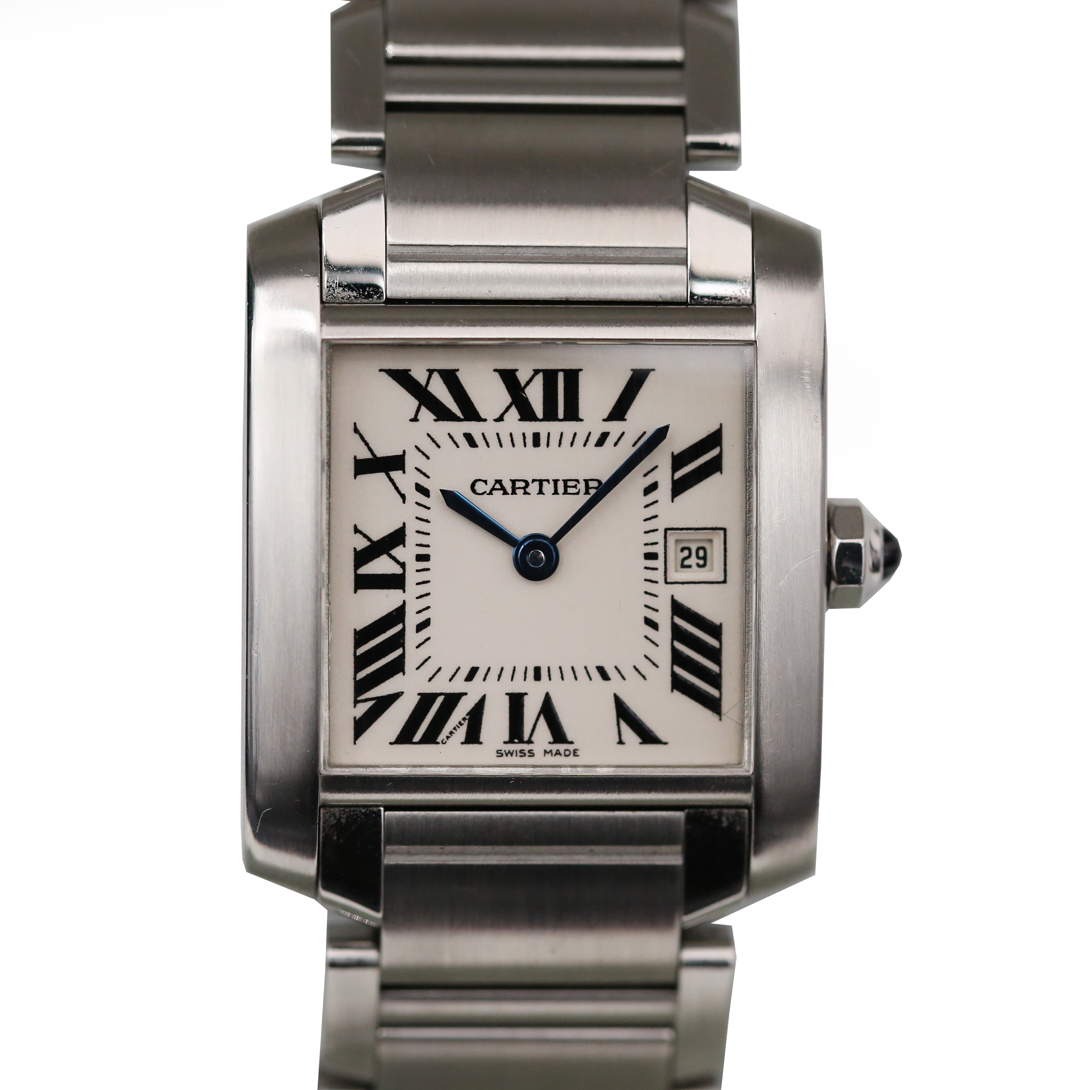 This Cartier Tank Francaise W51011Q3 has a silver roman numeral dial and a bracelet strap. This Cartier has undergone a thorough inspection of accuracy, functionality and condition at our Cartier certified service centre to determine the level of reconditioning required to meet our strict standards. It has also been checked against our records to ensure authenticity. All our watches have a 24-month warranty for your peace of mind.