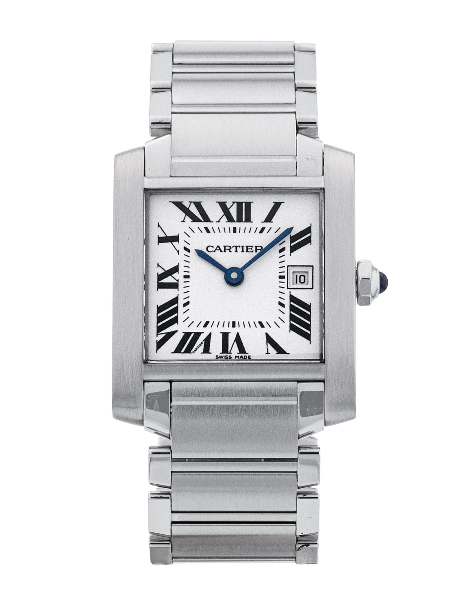 The Cartier Tank, inspired by an actual tank, has been a design milestone since its inception in the early 20th century. Unlike the modified pocket watches being made by other manufacturers, the Tank used a new case design that actually incorporated the lugs into its shape, rather than adding them as an afterthought. Other iconic design elements include the blued sword hands, Roman numerals, elegant square dial and octagonal crown complete with sapphire cabochon. The Française collection adds a somewhat sportier, more modern feel to an already superb timepiece, making it bolder and more versatile, in large part thanks to its chain-link bracelet.