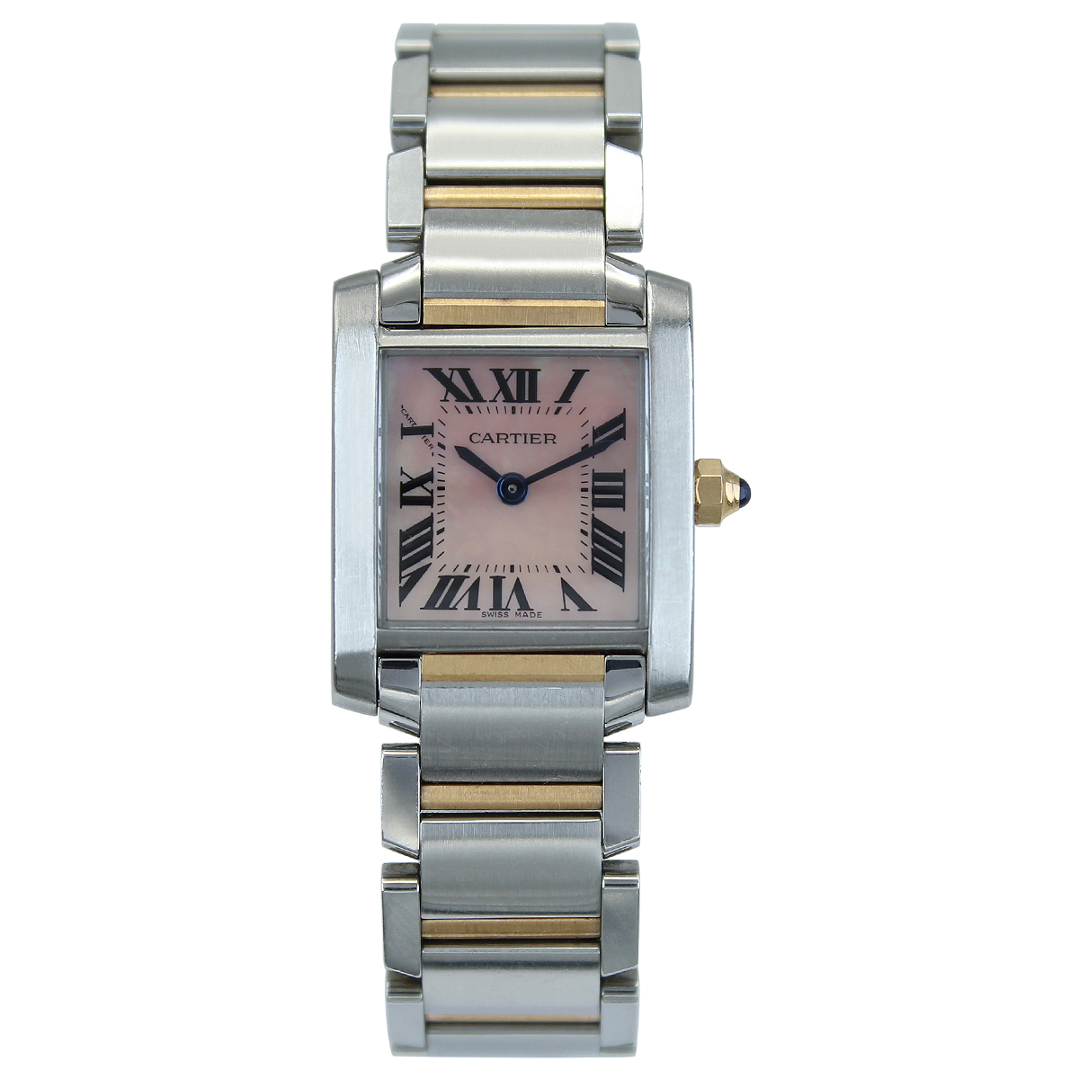 This Cartier Tank Francaise W51027Q4 has a mother of pearl pink roman numeral dial and a bracelet strap. This Cartier has undergone a thorough inspection of accuracy, functionality and condition at our Cartier certified service centre to determine the level of reconditioning required to meet our strict standards. It has also been checked against our records to ensure authenticity. All our watches have a 24-month warranty for your peace of mind.