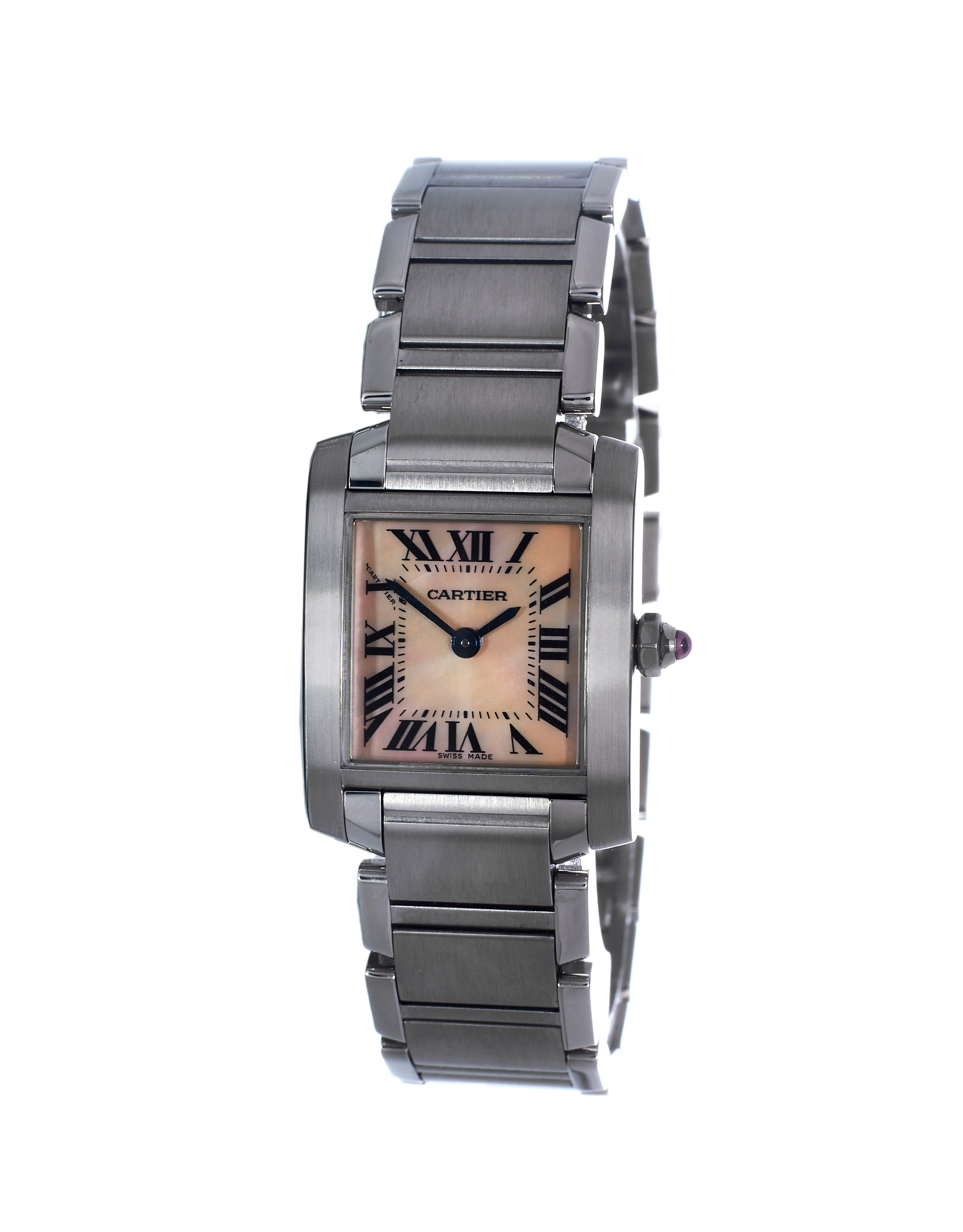 This Cartier Tank Francaise W51028Q3 has a mother of pearl pink roman numeral dial and a bracelet strap. This Cartier has undergone a thorough inspection of accuracy, functionality and condition at our Cartier certified service centre to determine the level of reconditioning required to meet our strict standards. It has also been checked against our records to ensure authenticity. All our watches have a 24-month warranty for your peace of mind.