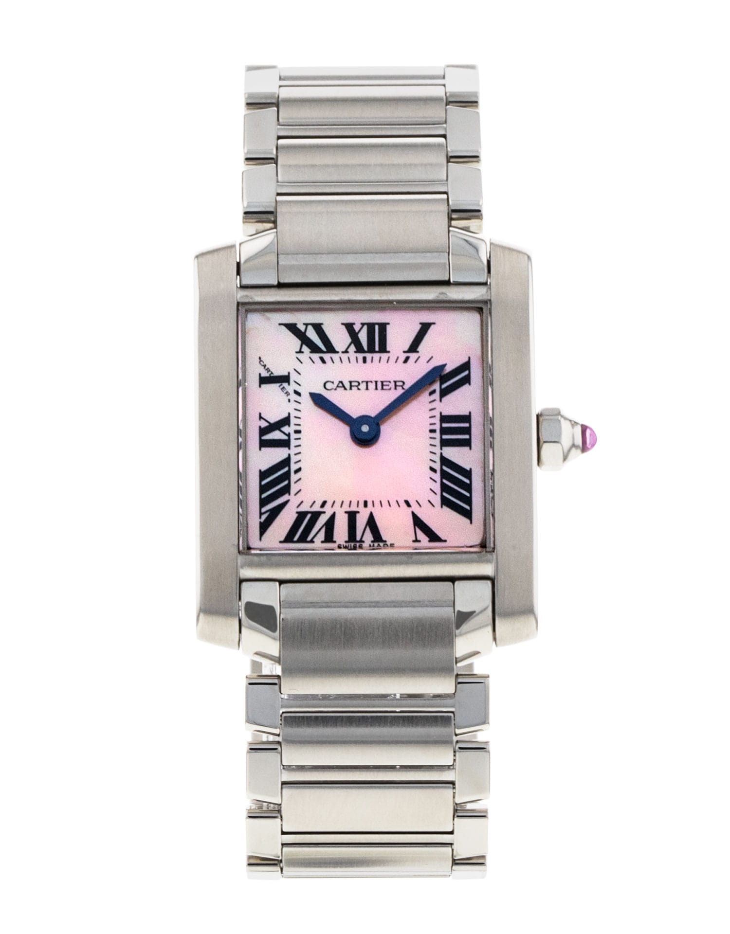 This Cartier Tank Francaise W51028Q3 has a mother of pearl pink roman numeral dial and a bracelet strap. This Cartier has undergone a thorough inspection of accuracy, functionality and condition at our Cartier certified service centre to determine the level of reconditioning required to meet our strict standards. It has also been checked against our records to ensure authenticity. All our watches have a 24-month warranty for your peace of mind.