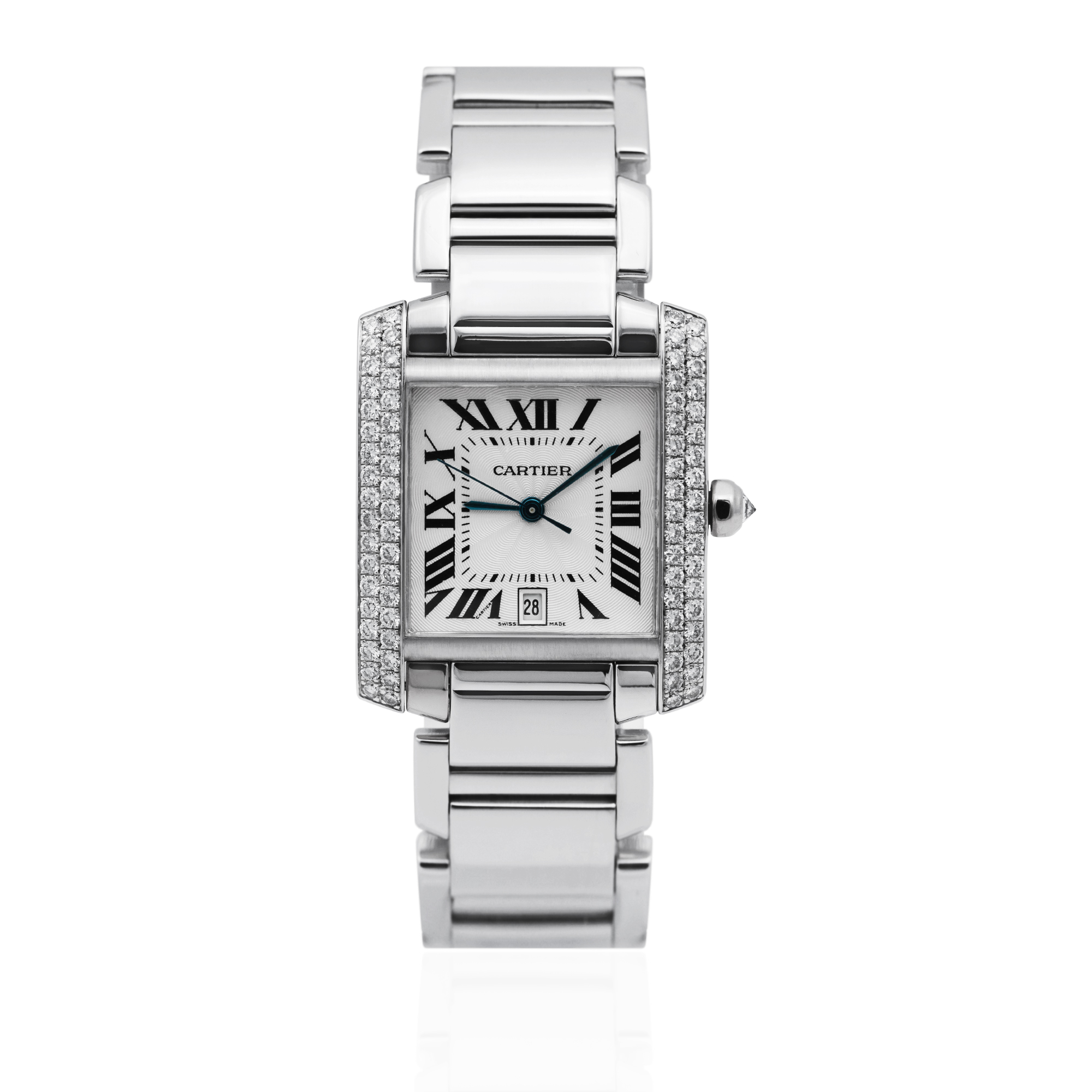 This Cartier Tank Francaise WE1003S3 has a silver roman numeral dial and a bracelet strap. This Cartier has undergone a thorough inspection of accuracy, functionality and condition at our Cartier certified service centre to determine the level of reconditioning required to meet our strict standards. It has also been checked against our records to ensure authenticity. All our watches have a 24-month warranty for your peace of mind.