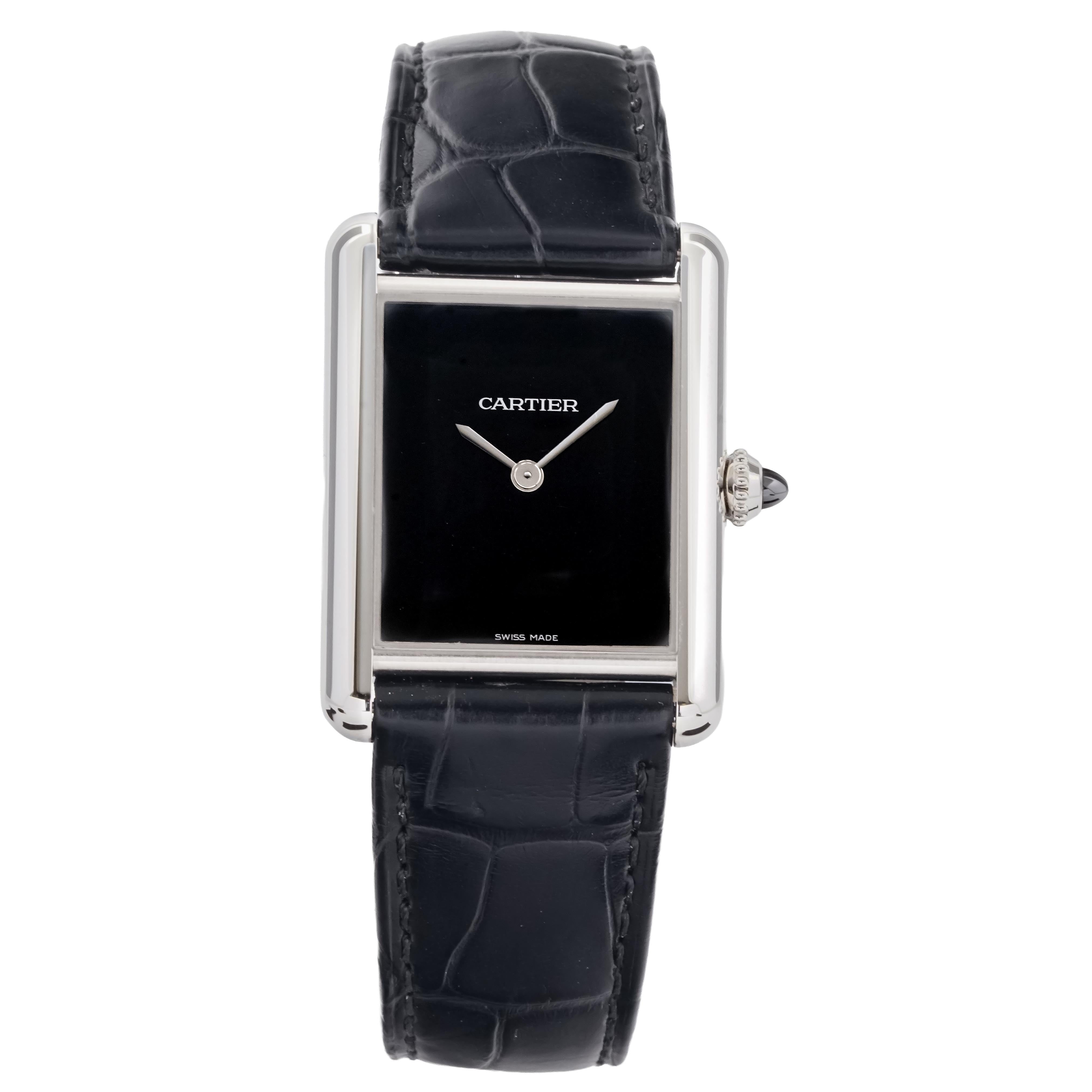 This Cartier Tank Must WSTA0064 has a black dial and a leather strap. This Cartier has undergone a thorough inspection of accuracy, functionality and condition at our Cartier certified service centre to determine the level of reconditioning required to meet our strict standards. It has also been checked against our records to ensure authenticity. Our watches have a 24-month warranty for your peace of mind, in conjunction with any remaining manufacturer’s warranty from new or from service.