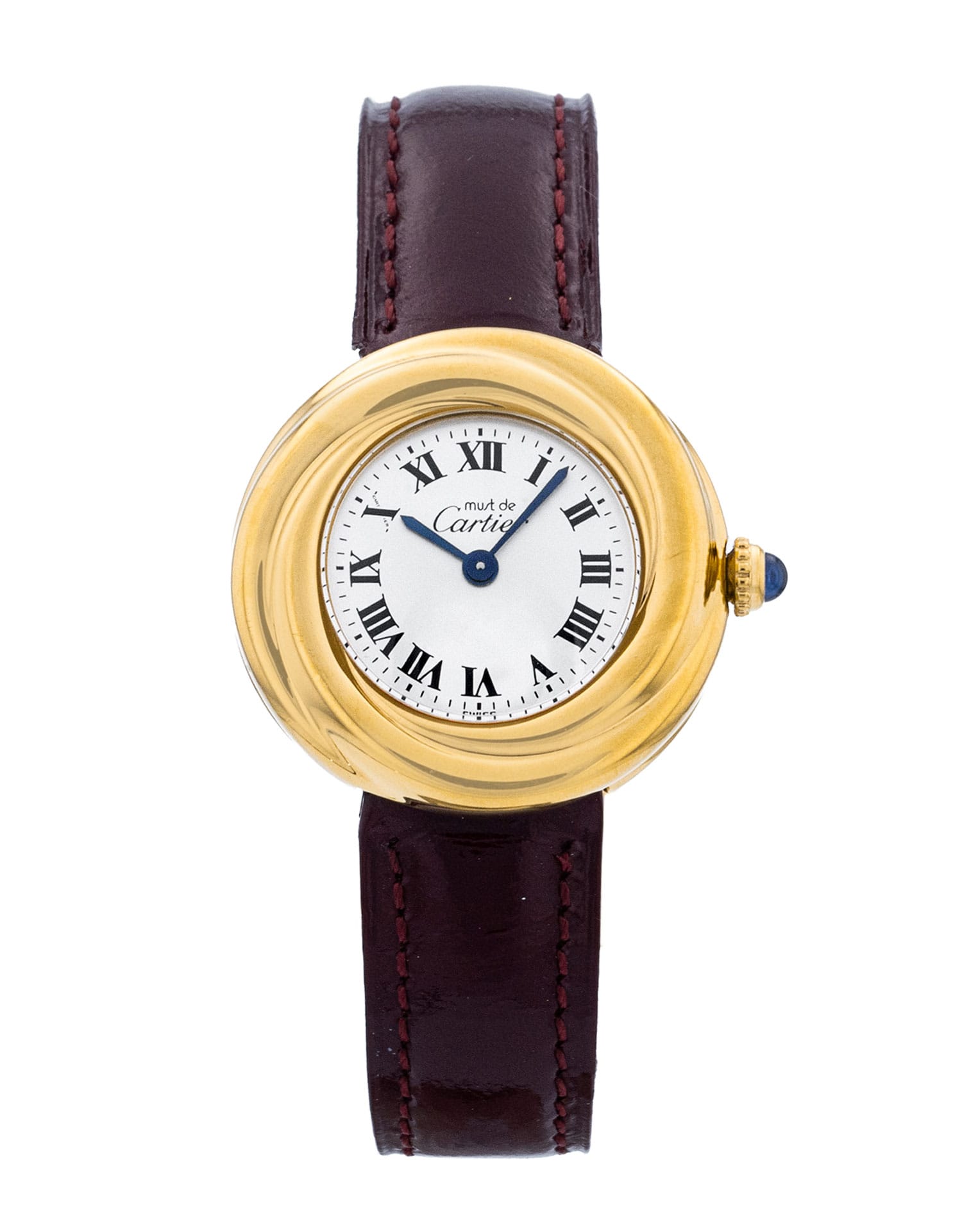 This Cartier Trinity W1010644 has a silver roman numeral dial and a leather strap. This Cartier has undergone a thorough inspection of accuracy, functionality and condition at our Cartier certified service centre to determine the level of reconditioning required to meet our strict standards. It has also been checked against our records to ensure authenticity. All our watches have a 24-month warranty for your peace of mind.