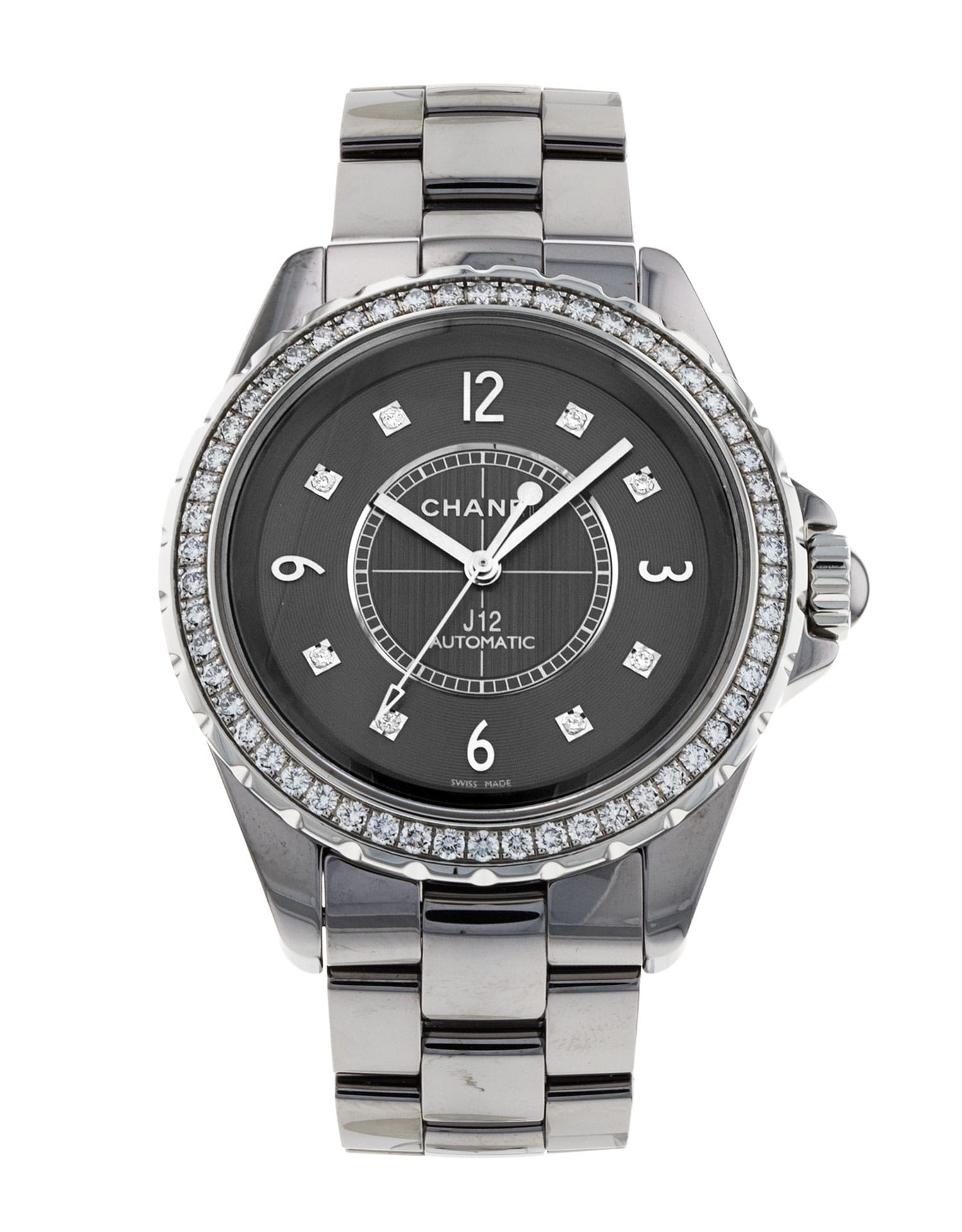 This Chanel J12 H2566 has a grey diamond dial and a bracelet strap. This Chanel has undergone a thorough inspection of water resistance, accuracy, functionality and condition to determine the level of reconditioning required to meet our strict standards. It has also been referenced against technical documents and manufacturer records where available to ensure authenticity and a clean history. All our watches have a 24-month warranty for your peace of mind.