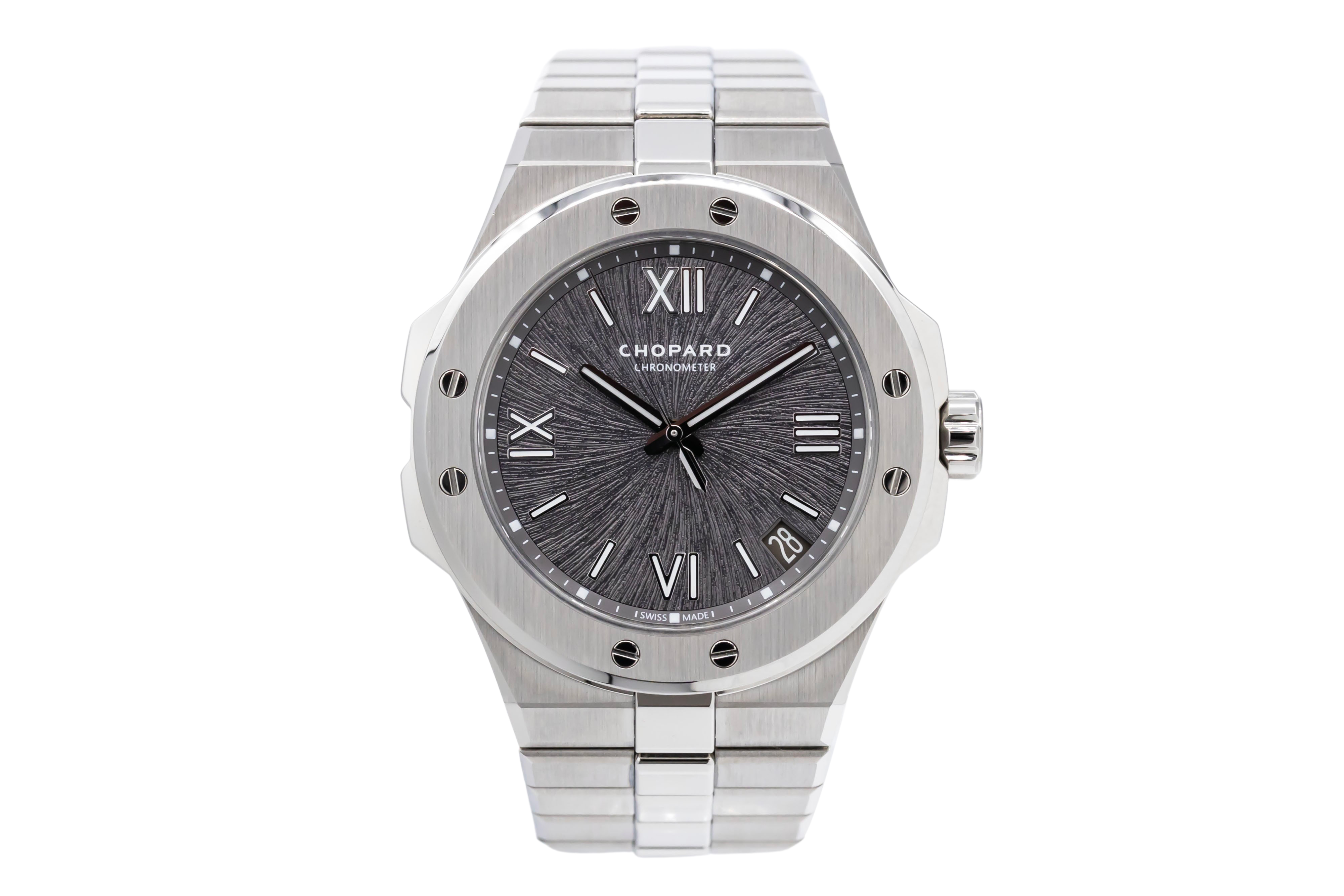 This Chopard Alpine Eagle 298600-3002 has a grey quarter roman numeral dial and a bracelet strap. This Chopard has undergone a thorough inspection of water resistance, accuracy, functionality and condition to determine the level of reconditioning required to meet our strict standards. It has also been referenced against technical documents and manufacturer records where available to ensure authenticity and a clean history. All our watches have a 24-month warranty for your peace of mind.