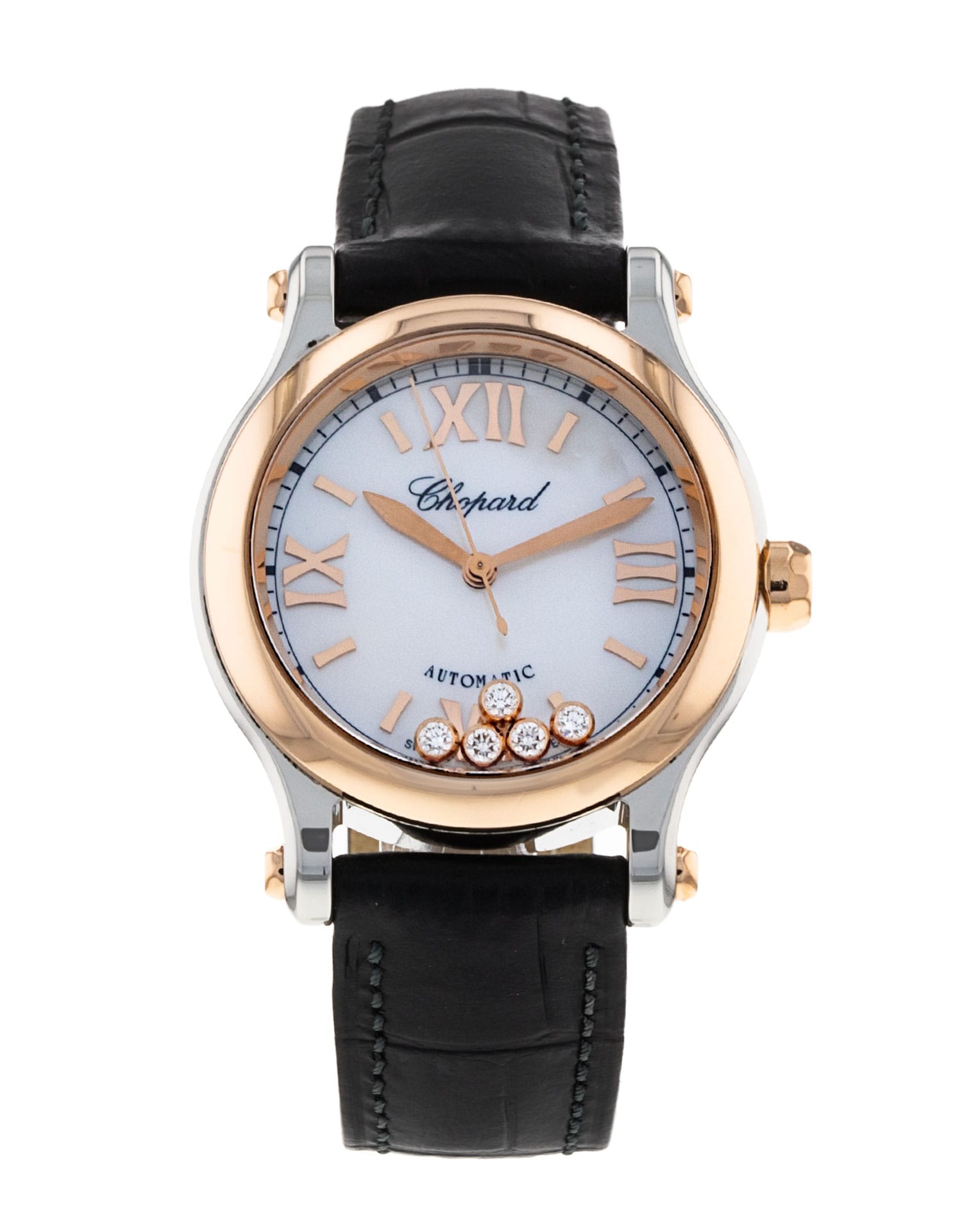 This Chopard Happy Sport 278573-6018 has a mother of pearl white - diamond dial and a leather strap. This Chopard has undergone a thorough inspection of water resistance, accuracy, functionality and condition to determine the level of reconditioning required to meet our strict standards. It has also been referenced against technical documents and manufacturer records where available to ensure authenticity and a clean history. All our watches have a 24-month warranty for your peace of mind.