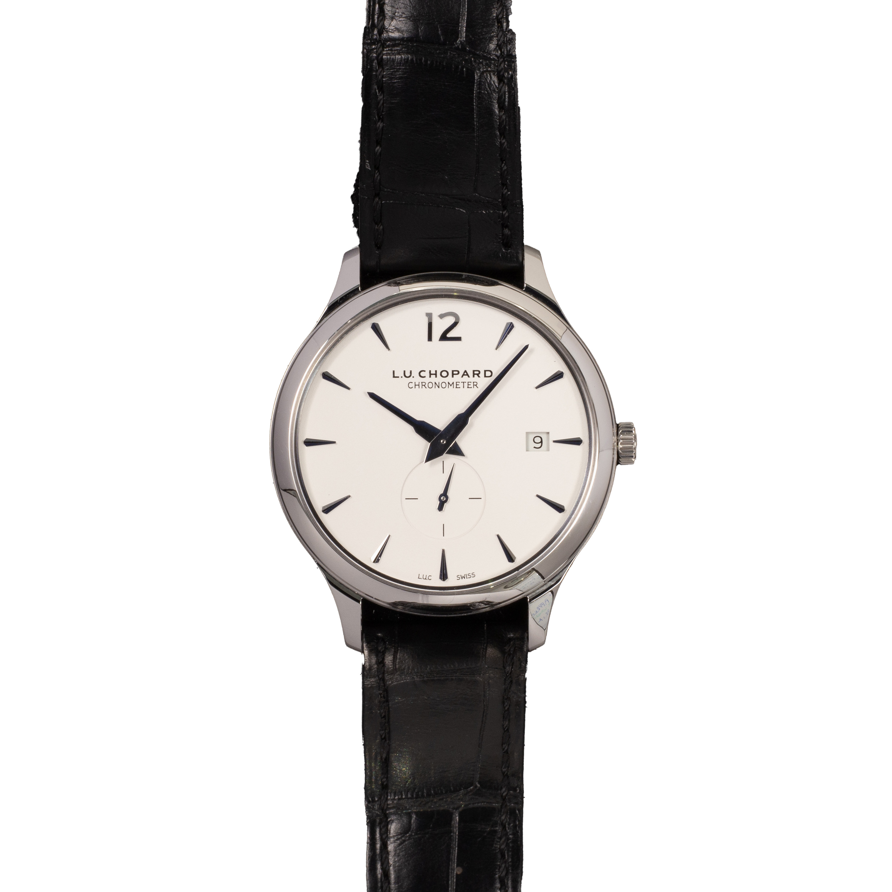 This Chopard LUC 168591-3001 has a silver baton dial and a leather strap. This Chopard has undergone a thorough inspection of water resistance, accuracy, functionality and condition to determine the level of reconditioning required to meet our strict standards. It has also been referenced against technical documents and manufacturer records where available to ensure authenticity and a clean history. All our watches have a 24-month warranty for your peace of mind.
