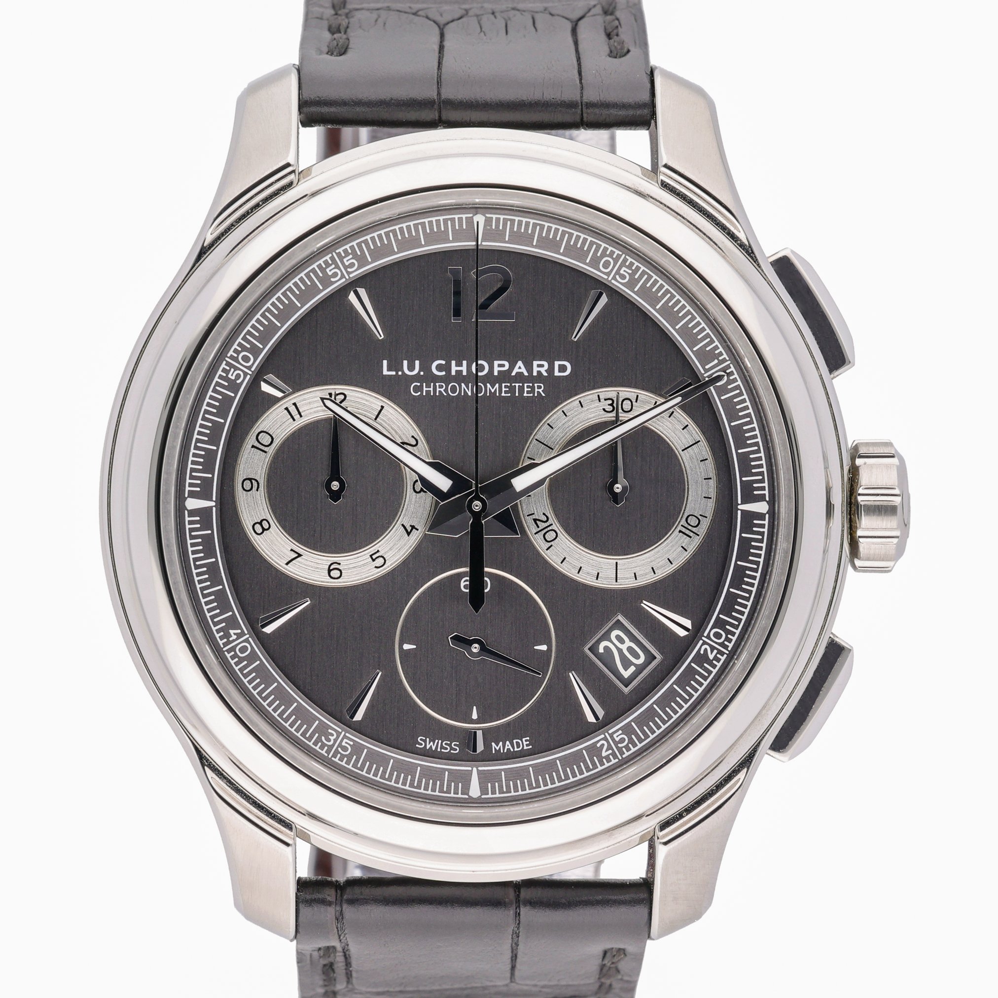 This Chopard LUC 168596-3001 has a grey dial and a leather strap. This Chopard has undergone a thorough inspection of water resistance, accuracy, functionality and condition to determine the level of reconditioning required to meet our strict standards. It has also been referenced against technical documents and manufacturer records where available to ensure authenticity and a clean history. All our watches have a 24-month warranty for your peace of mind.