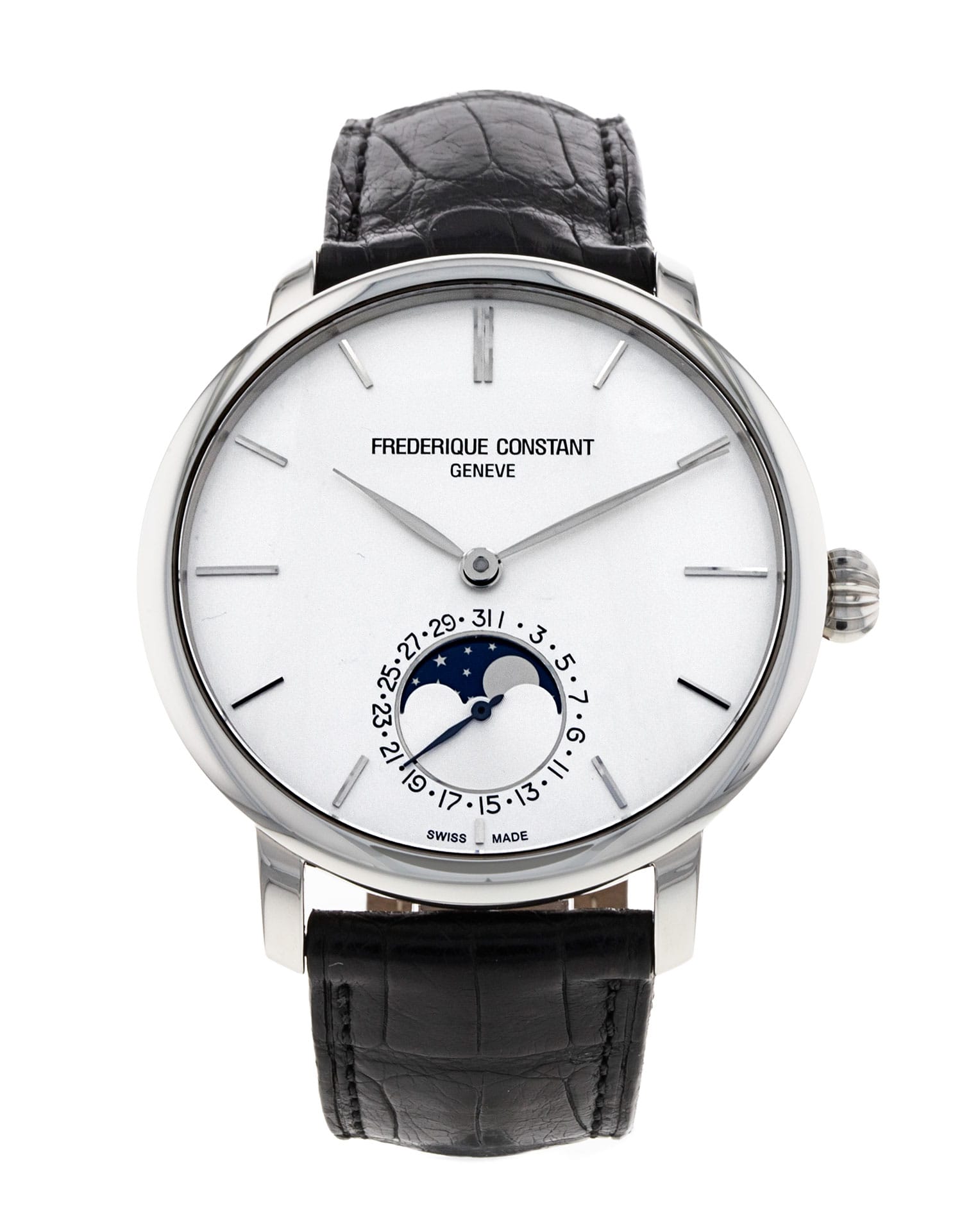 This Frederique Constant Slim Line FC–705X4S4/5/6 has a silver baton dial and a leather strap. This Frederique Constant has undergone a thorough inspection of water resistance, accuracy, functionality and condition to determine the level of reconditioning required to meet our strict standards. It has also been referenced against technical documents and manufacturer records where available to ensure authenticity and a clean history. All our watches have a 24-month warranty for your peace of mind.